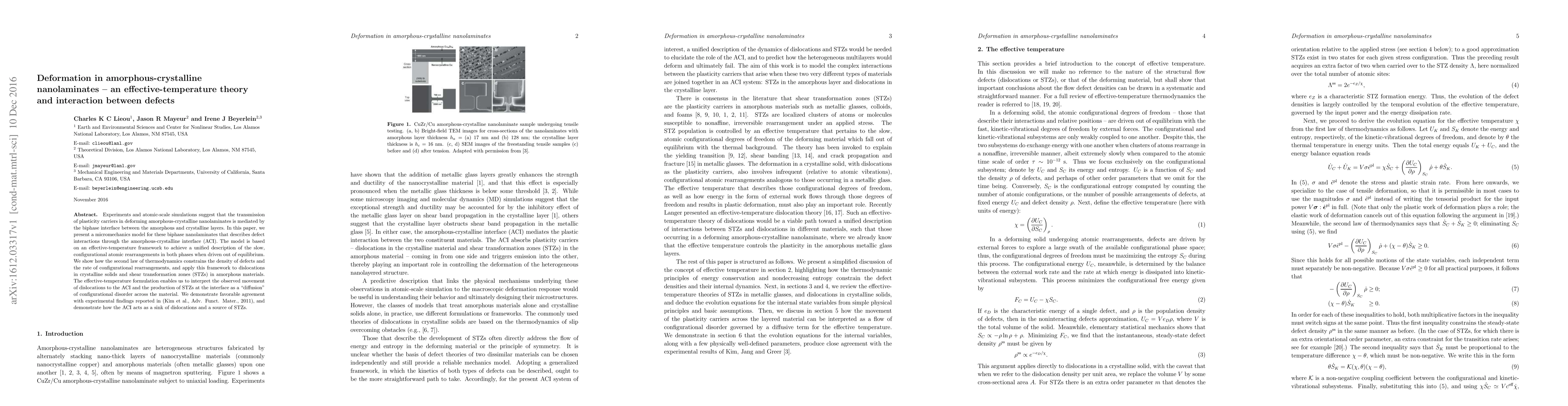 This paper develops a micromechanics model for amorphous-crystalline nanolaminates using an effective-temperature framework to describe defect interactions at the biphase interface. The model successfully interprets dislocation movement and shear transformation zone production as configurational disorder diffusion, aligning well with experimental observations.