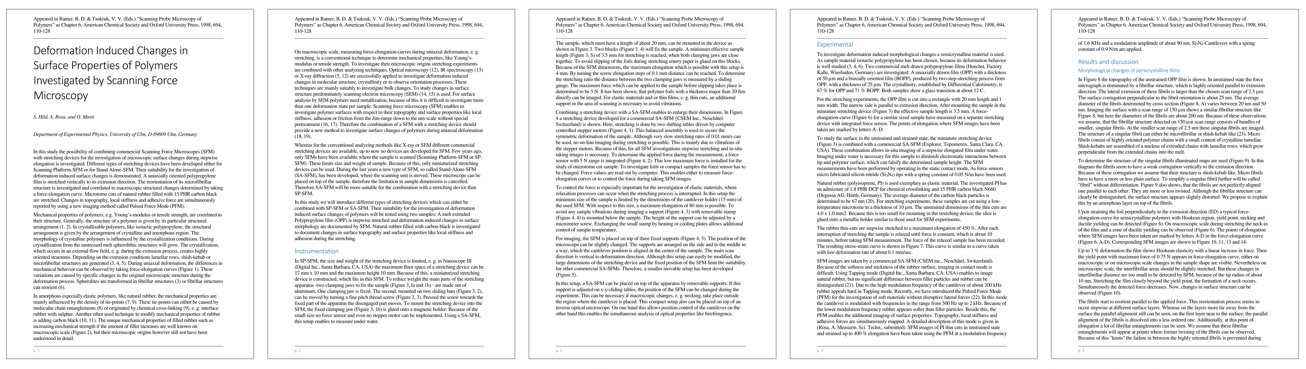 In this study the possibility of combining commercial Scanning Force Microscopes (SFM) with stretching devices for the investigation of microscopic surface changes during stepwise elongation is investigated. Different types of stretching devices have been developed either for Scanning Platform-SFM or for Stand Alone-SFM. Their suitability for the investigation of deformation induced surface changes is demonstrated. A uniaxially oriented polypropylene film is stretched vertically to its extrusion direction. The reorientation of its microfibrillar structure is investigated and correlated to macroscopic structural changes determined by taking a force-elongation curve. Microtome cuts of natural rubber filled with 15 PHR carbon black are stretched. Changes in topography, local stiffness and adhesive force are simultaneously reported by using a new imaging method called Pulsed Force Mode (PFM).
