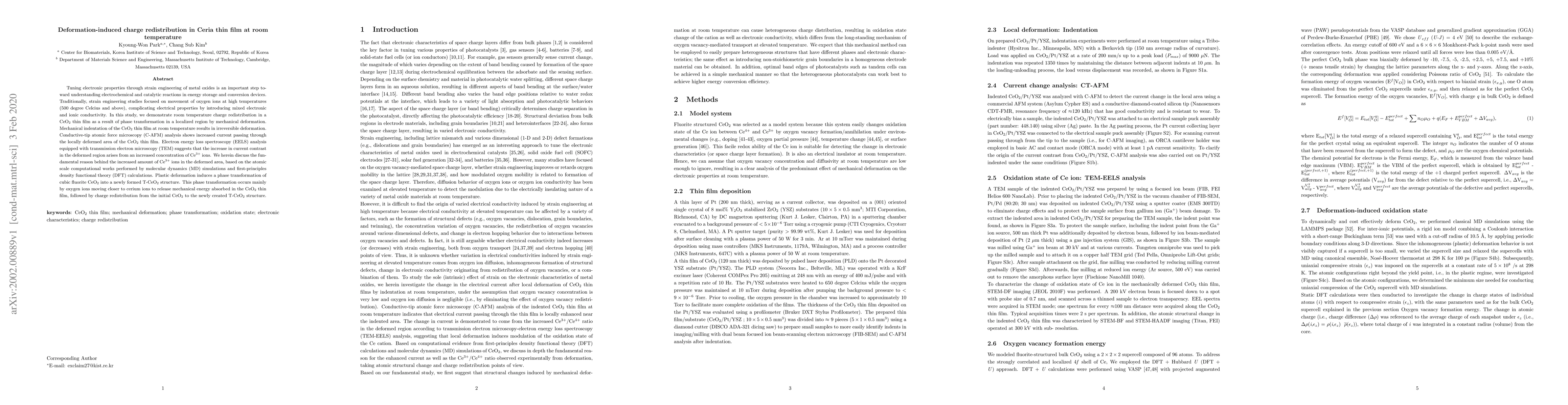 This study reveals room-temperature charge redistribution in CeO2 thin films via mechanical deformation, causing a phase transformation from cubic to T-CeO2 structure and an increase in Ce3+ ions, as demonstrated by C-AFM and EELS analyses, supported by MD simulations and DFT calculations.