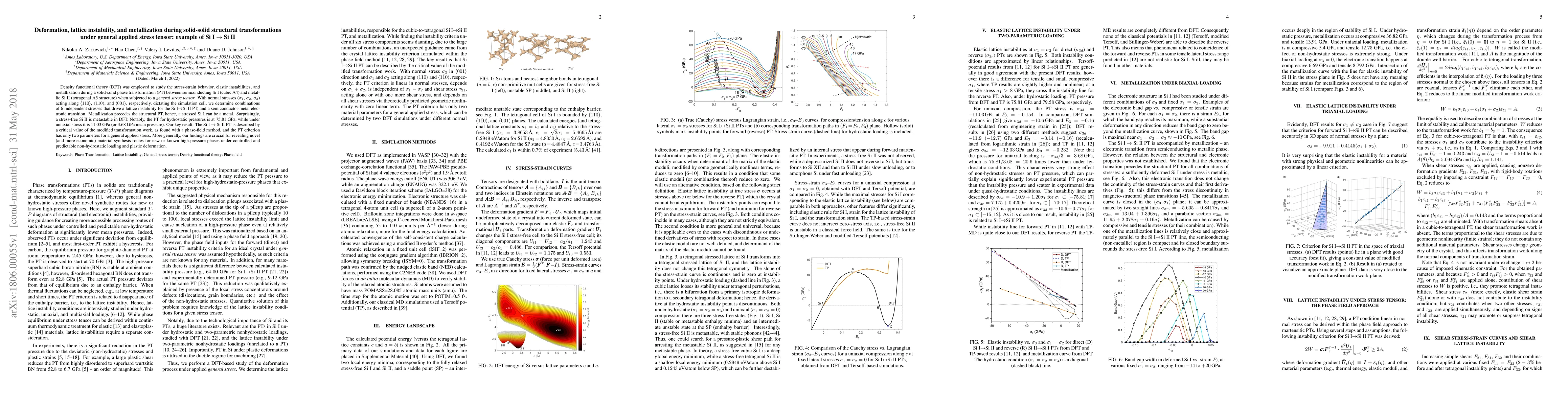 Density functional theory (DFT) was employed to study the stress-strain behavior, elastic instabilities, and metallization during a solid-solid phase transformation (PT) between semiconducting Si I (cubic A4) and metallic Si II (tetragonal A5 structure) when subjected to a general stress tensor. With normal stresses ($\sigma_1$, $\sigma_2$, $\sigma_3$) acting along $\left<110 \right>$, $\left<1\bar{1}0 \right>$, and $\left<001\right>$, respectively, dictating the simulation cell, we determine combinations of 6 independent stresses that drive a lattice instability for the Si I$\rightarrow$Si II PT, and a semiconductor-metal electronic transition. Metallization precedes the structural PT, hence, a stressed Si I can be a metal. Surprisingly, a stress-free Si II is metastable in DFT. Notably, the PT for hydrostatic pressures is at 75.81 GPa, while under uniaxial stress it is 11.03 GPa (or 3.68 GPa mean pressure). Our key result: The Si I -> Si II PT is described by a critical value of the modified transformation work, as found with a phase-field method, and the PT criterion has only two parameters for a general applied stress. More generally, our findings are crucial for revealing novel (and more economic) material synthesis routes for new or known high-pressure phases under controlled and predictable non-hydrostatic loading and plastic deformation.