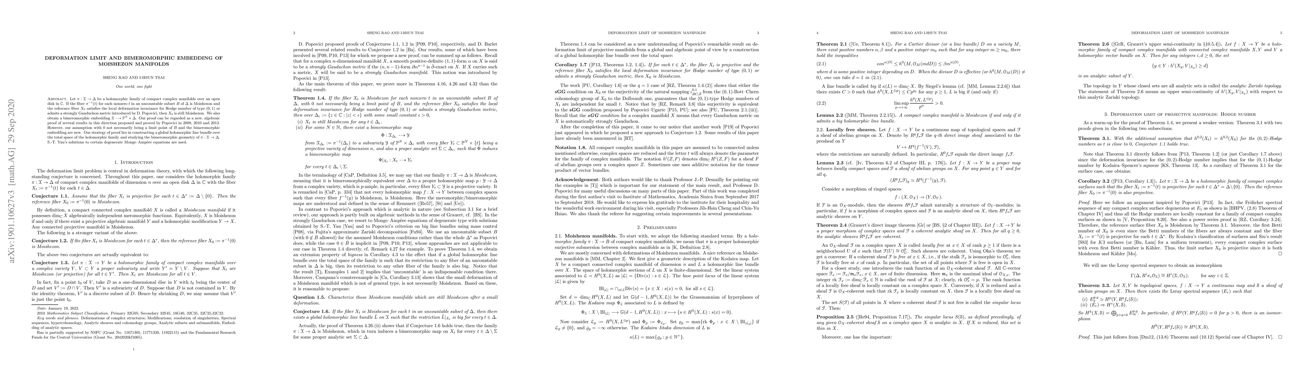 Let $\pi: \mathcal{X}\rightarrow \Delta$ be a holomorphic family of compact complex manifolds over an open disk in $\mathbb{C}$. If the fiber $\pi^{-1}(t)$ for each nonzero $t$ in an uncountable subset $B$ of $\Delta$ is Moishezon and the reference fiber $X_0$ satisfies the local deformation invariance for Hodge number of type $(0,1)$ or admits a strongly Gauduchon metric introduced by D. Popovici, then $X_0$ is still Moishezon. We also obtain a bimeromorphic embedding $\mathcal{X}\dashrightarrow\mathbb{P}^N\times\Delta$. Our proof can be regarded as a new, algebraic proof of several results in this direction proposed and proved by Popovici in 2009, 2010 and 2013. However, our assumption with $0$ not necessarily being a limit point of $B$ and the bimeromorphic embedding are new. Our strategy of proof lies in constructing a global holomorphic line bundle over the total space of the holomorphic family and studying the bimeromorphic geometry of $\pi:\mathcal{X}\rightarrow \Delta$. S.-T. Yau's solutions to certain degenerate Monge--Amp\`ere equations are used.