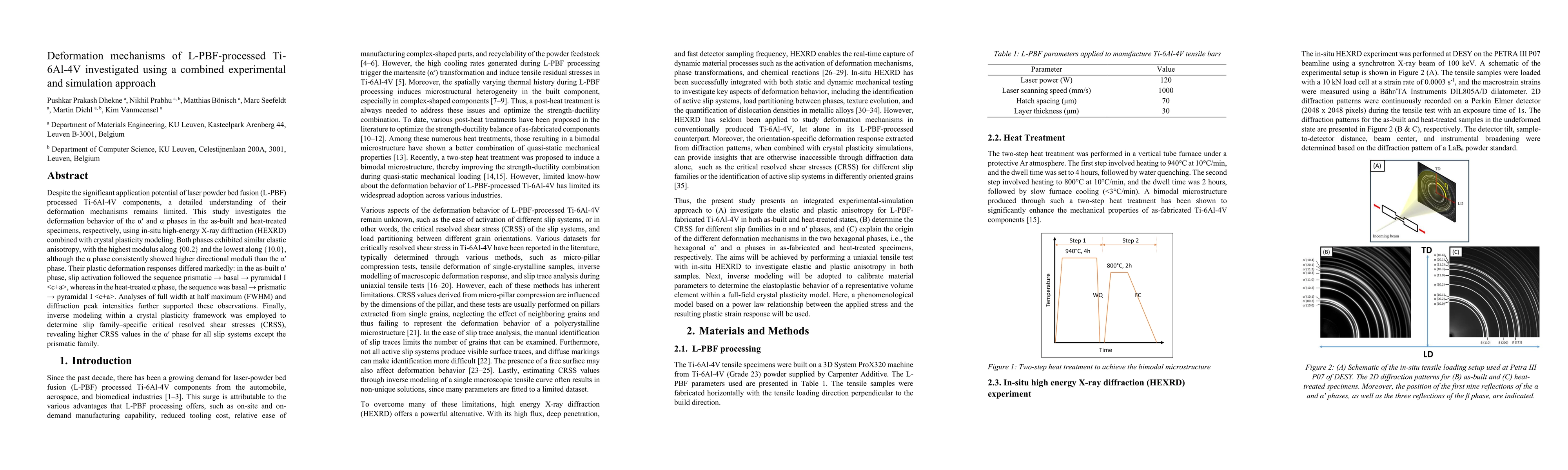 Despite the significant application potential of laser powder bed fusion (L-PBF) processed Ti-6Al-4V components, a detailed understanding of their deformation mechanisms remains limited. This study investigates the deformation behavior of the {\alpha^\prime} and {\alpha} phases in the as-built and heat-treated specimens, respectively, using in-situ high-energy X-ray diffraction (HEXRD) combined with crystal plasticity modeling. Both phases exhibited similar elastic anisotropy, with the highest modulus along \{00.2\} and the lowest along \{10.0\}, although the {\alpha} phase consistently showed higher directional moduli than the {\alpha^\prime} phase. Their plastic deformation responses differed markedly: in the as-built {\alpha^\prime} phase, slip activation followed the sequence prismatic \rightarrow basal \rightarrow pyramidal I \langle c+a \rangle, whereas in the heat-treated {\alpha} phase, the sequence was basal \rightarrow prismatic \rightarrow pyramidal I \langle c+a \rangle. Analyses of full width at half maximum (FWHM) and diffraction peak intensities further supported these observations. Finally, inverse modeling within a crystal plasticity framework was employed to determine slip family--specific critical resolved shear stresses (CRSS), revealing higher CRSS values in the {\alpha^\prime} phase for all slip systems except the prismatic family.