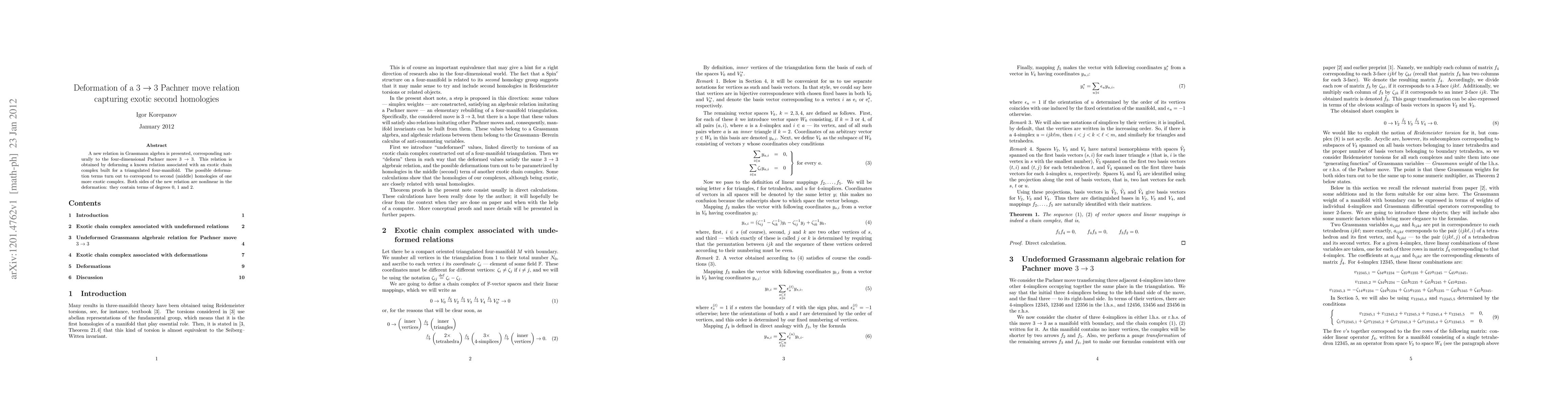 A new relation in Grassmann algebra is presented, corresponding naturally to the four-dimensional Pachner move 3 -> 3. This relation is obtained by deforming a known relation associated with an exotic chain complex built for a triangulated four-manifold. The possible deformation terms turn out to correspond to second (middle) homologies of one more exotic complex. Both sides of the new relation are nonlinear in the deformation: they contain terms of degrees 0, 1 and 2.