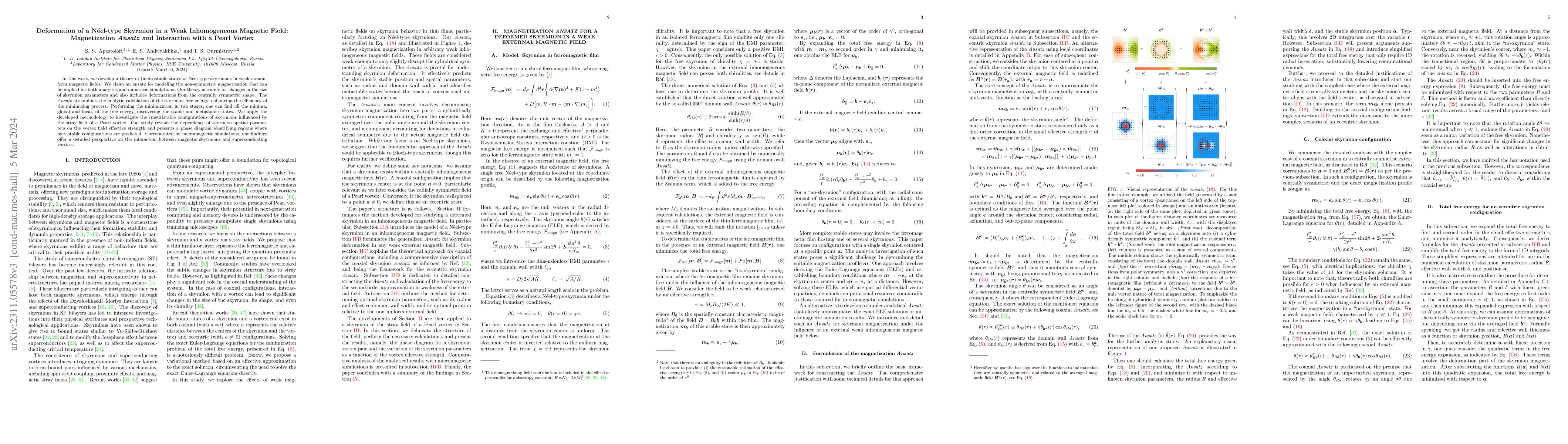 This research develops a theory for N\'eel-type skyrmions in weak inhomogeneous magnetic fields, proposing an Ansatz for non-symmetric magnetization. The methodology reveals skyrmion deformations and their interaction with Pearl vortices, providing a phase diagram for stable and metastable states corroborated by micromagnetic simulations.