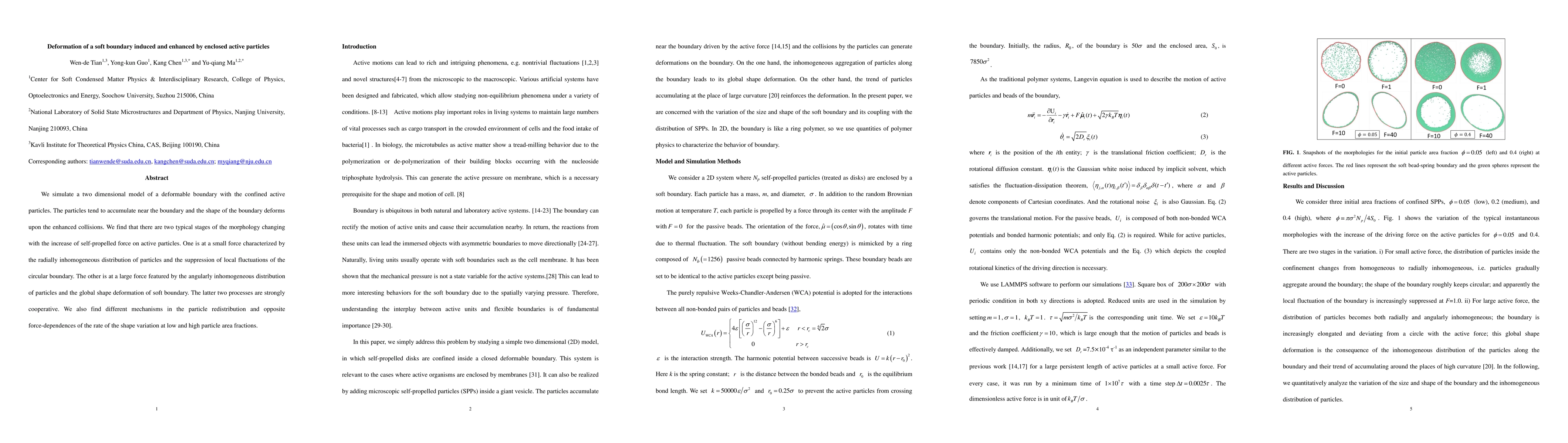 We simulate a two dimensional model of self-propelled particles confined by a deformable boundary. The particles tend to accumulate near the boundary and the shape of the boundary deforms upon the collisions. We find that there are two typical stages in the variation of the morphology with the increase of active force. One is at small force characterized by radially inhomogeneous redistribution of particles and suppression of local fluctuations of the boundary. The other is at large force featured by angularly redistribution of particles and global shape deformation of the boundary. The last two processes are strongly cooperative. We also find different mechanisms in the particle redistribution and opposite force-dependences of the rate of the shape variation at low and high particle concentrations.