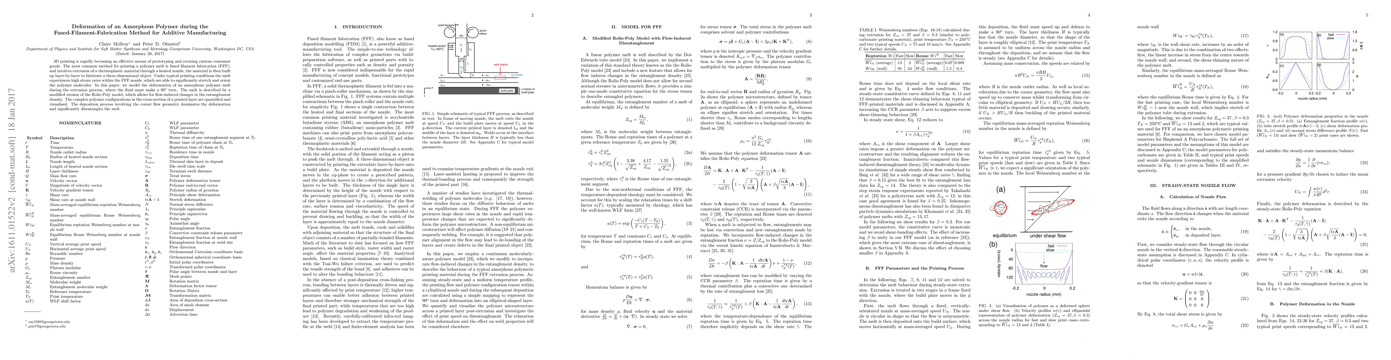 This paper models the deformation of an amorphous polymer melt during fused filament fabrication (FFF) 3D printing, focusing on the high strain rates and molecular orientation caused by a 90° turn in the extrusion process. The study uses a modified Rolie-Poly model to quantify and visualize the complex polymer configurations, revealing significant disentanglement due to the corner flow geometry.