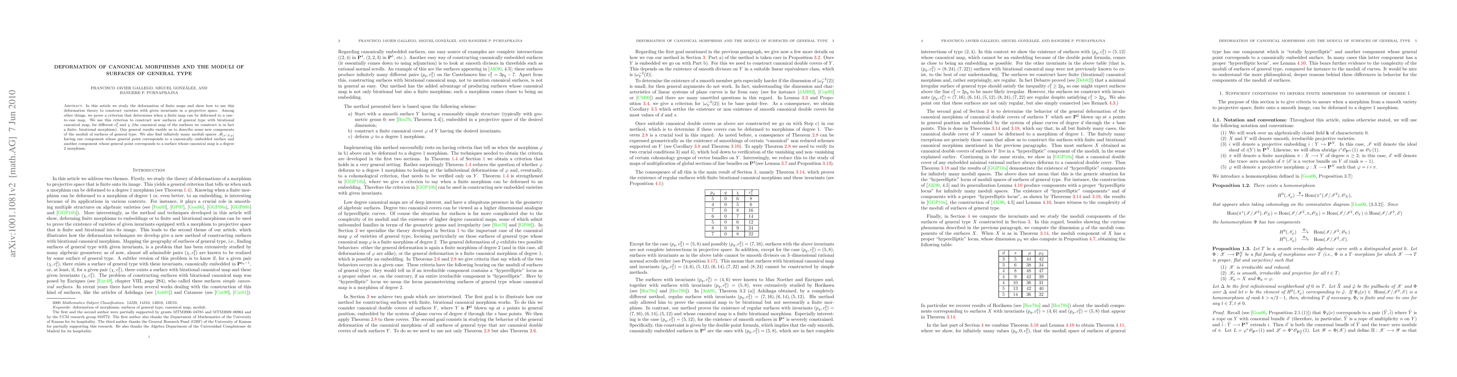 In this article we study the deformation of finite maps and show how to use this deformation theory to construct varieties with given invariants in a projective space. Among other things, we prove a criterion that determines when a finite map can be deformed to a one--to--one map. We use this criterion to construct new simple canonical surfaces with different $c_1^2$ and $\chi$. Our general results enable us to describe some new components of the moduli of surfaces of general type. We also find infinitely many moduli spaces $\mathcal M_{(x',0,y)}$ having one component whose general point corresponds to a canonically embedded surface and another component whose general point corresponds to a surface whose canonical map is a degree 2 morphism.