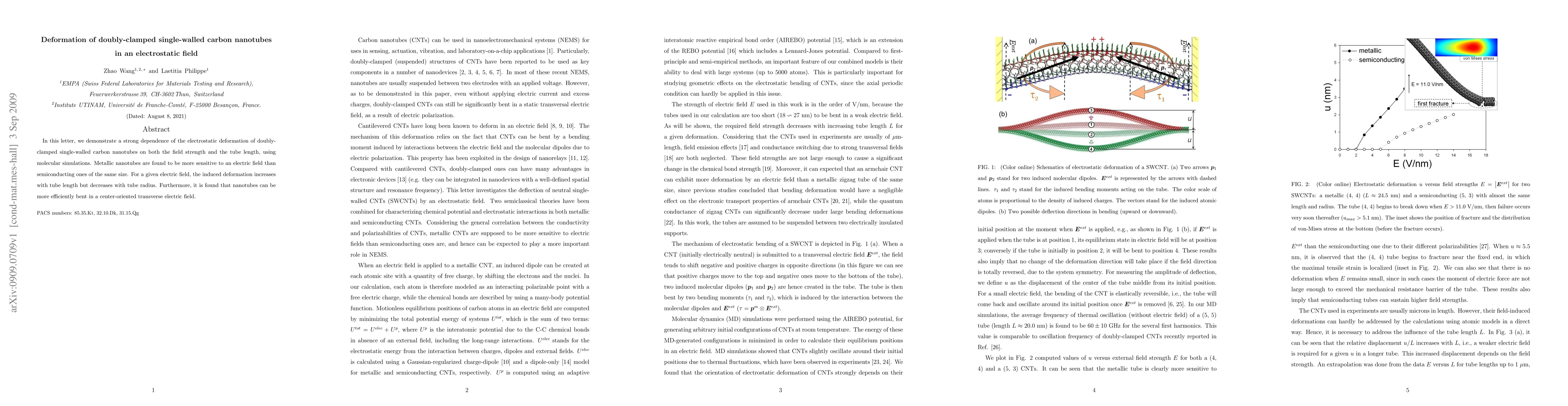 This study reveals that the electrostatic deformation of doubly-clamped single-walled carbon nanotubes is strongly influenced by both electric field strength and tube length, as shown through molecular simulations. Metallic nanotubes exhibit greater sensitivity to electric fields compared to semiconducting ones of the same dimensions.