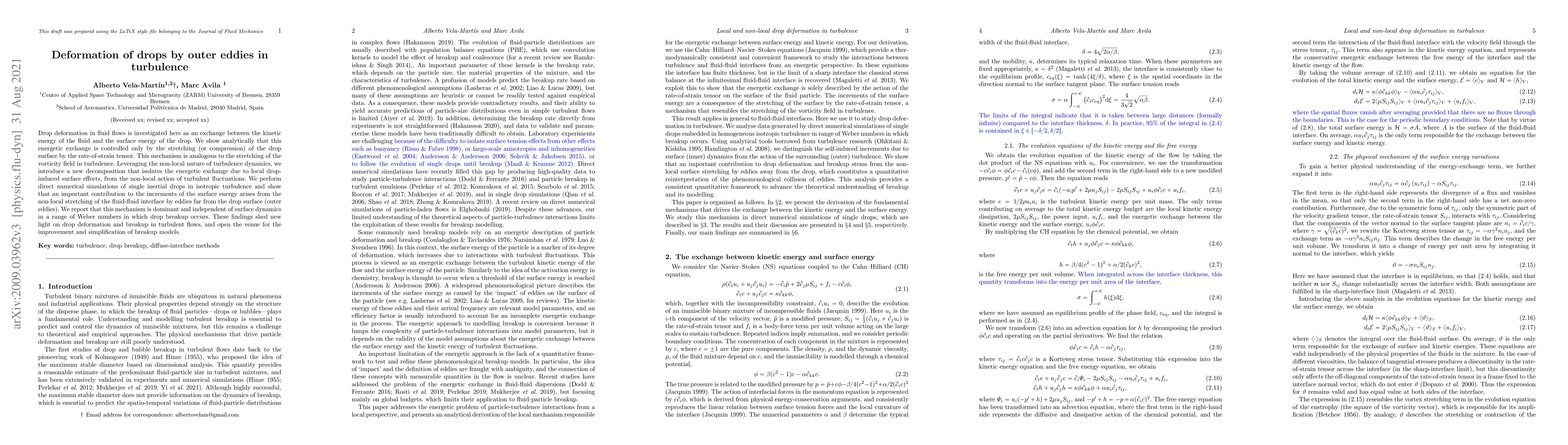 Drop deformation in fluid flows is investigated here as an exchange between the kinetic energy of the fluid and the surface energy of the drop. We show analytically that this energetic exchange is controlled only by the stretching (or compression) of the drop surface by the rate-of-strain tensor. This mechanism is analogous to the stretching of the vorticity field in turbulence. Leveraging the non-local nature of turbulence dynamics, we introduce a new decomposition that isolates the energetic exchange due to local drop-induced surface effects, from the non-local action of turbulent fluctuations. We perform direct numerical simulations of single inertial drops in isotropic turbulence and show that an important contribution to the increments of the surface energy arises from the non-local stretching of the fluid-fluid interface by eddies far from the drop surface (outer eddies). We report that this mechanism is dominant and independent of surface dynamics in a range of Weber numbers in which drop breakup occurs. These findings shed new light on drop deformation and breakup in turbulent flows, and open the venue for the improvement and simplification of breakup models.