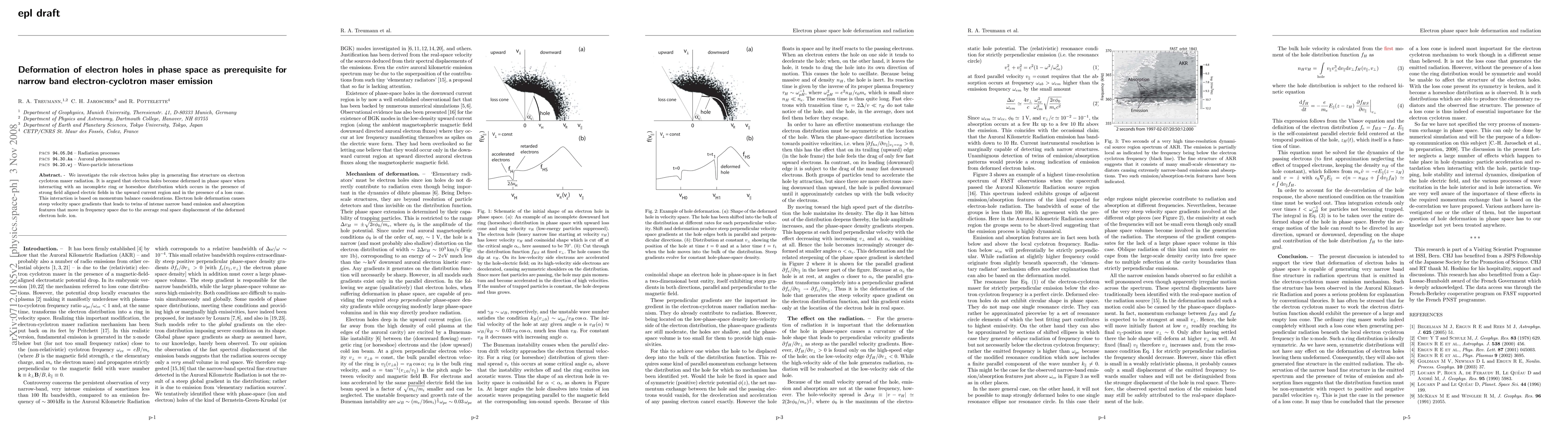 This paper qualitatively discusses how electron holes deform in phase space, leading to fine structure in electron cyclotron maser radiation. The deformation occurs when electron holes interact with an incomplete ring or horseshoe distribution, resulting in narrow band maser emission due to steep velocity space gradients.