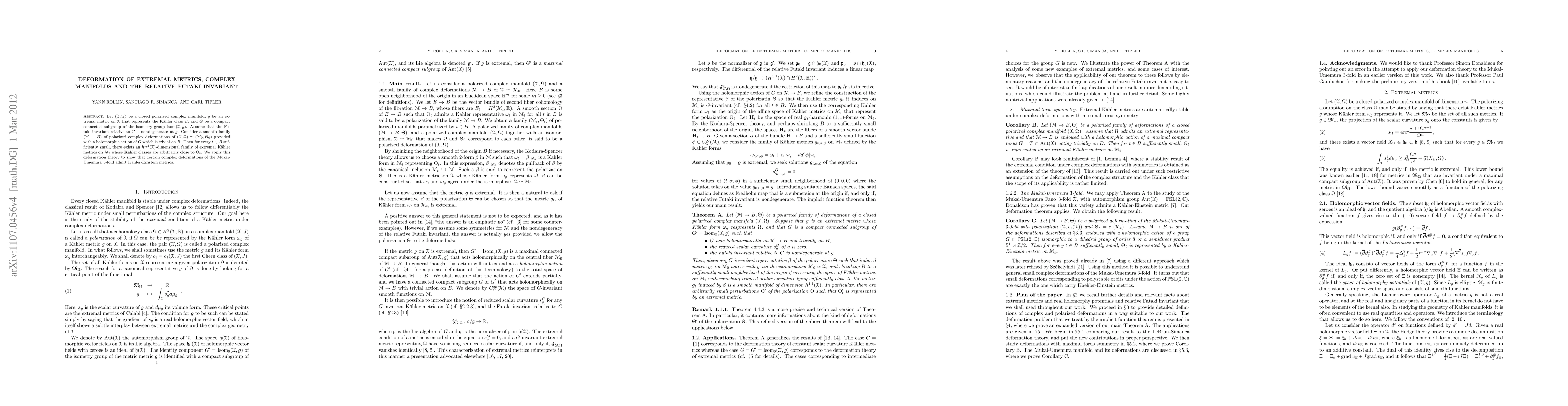 Let (X,\Omega) be a closed polarized complex manifold, g be an extremal metric on X that represents the K\"ahler class \Omega, and G be a compact connected subgroup of the isometry group Isom(X,g). Assume that the Futaki invariant relative to G is nondegenerate at g. Consider a smooth family $(M \to B)$ of polarized complex deformations of (X,\Omega)\simeq (M_0,\Theta_0) provided with a holomorphic action of G with trivial action on B. Then for every t\in B sufficiently small, there exists an h^{1,1}(X)-dimensional family of extremal Kaehler metrics on M_t whose K\"ahler classes are arbitrarily close to \Theta_t. We apply this deformation theory to show that certain complex deformations of the Mukai-Umemura 3-fold admit Kaehler-Einstein metrics.