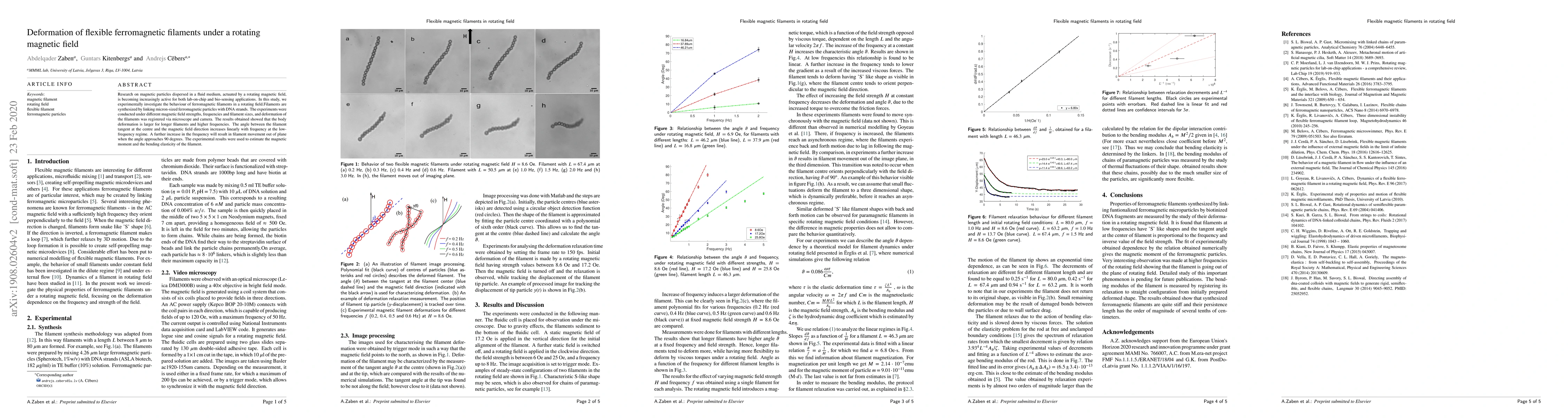 Research on magnetic particles dispersed in a fluid medium, actuated by a rotating magnetic field, is becoming increasingly active for both lab-on-chip and bio-sensing applications. In this study, we experimentally investigate the behaviour of ferromagnetic filaments in a rotating field. Filaments are synthesized by linking micron-sized ferromagnetic particles with DNA strands. The experiments were conducted under different magnetic field strengths, frequencies and filament sizes, and deformation of the filaments was registered via microscope and camera. The results obtained showed that the body deformation is larger for longer filaments and higher frequencies and lower for larger magnetic field. The angle between the filament tangent at the centre and the magnetic field direction increases linearly with frequency at low-frequency regime. A further increase in the frequency will result in filament movement out of plane when the angle approaches 90 degrees. The experimental results were used to estimate magnetic moment and the bending elasticity of the filament.