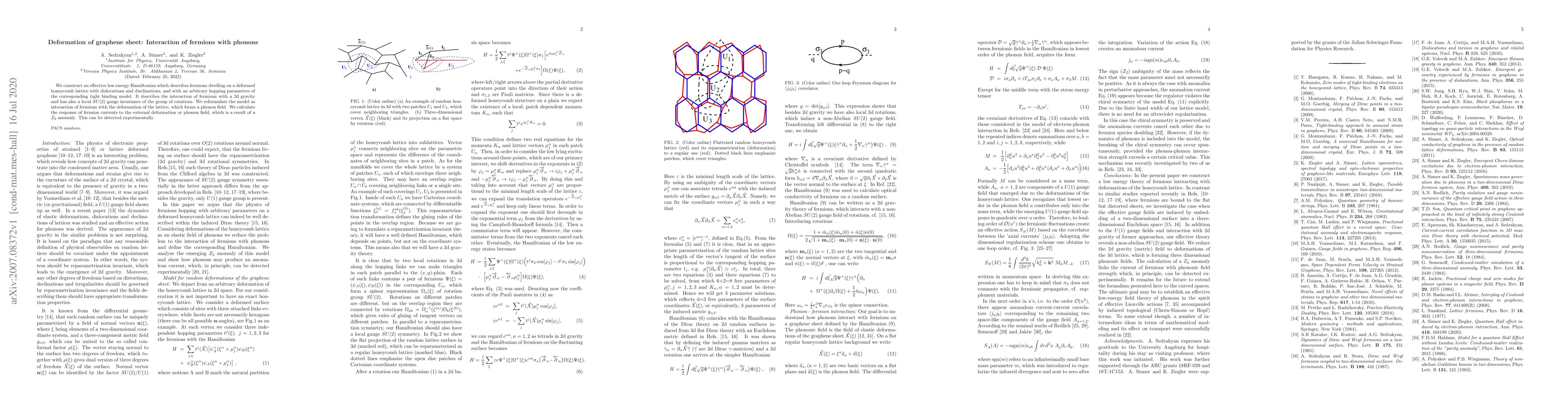 We construct an effective low energy Hamiltonian which describes fermions dwelling on a deformed honeycomb lattice with dislocations and disclinations, and with an arbitrary hopping parameters of the corresponding tight binding model. It describes the interaction of fermions with a 2d gravity and has also a local SU(2) gauge invariance of the group of rotations. We reformulate the model as interaction of fermions with the deformation of the lattice, which forms a phonon field. We calculate the response of fermion currents to the external deformation or phonon field, which is a result of a Z_2 anomaly. This can be detected experimentally.