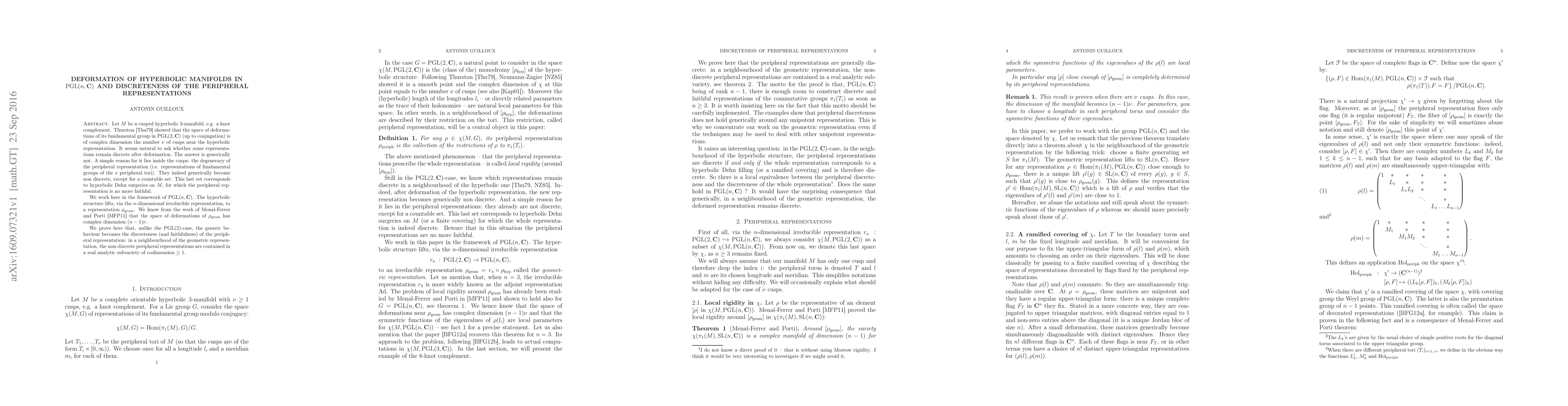 This paper investigates the deformation of hyperbolic 3-manifolds in $\mathrm {PGL}(n,\mathbf {C})$ and examines the discreteness of peripheral representations. Unlike in $\mathrm {PGL}(2,\mathbf {C})$, the authors prove that in higher dimensions, peripheral representations generally remain discrete and faithful, with non-discrete representations forming a lower-dimensional subset.