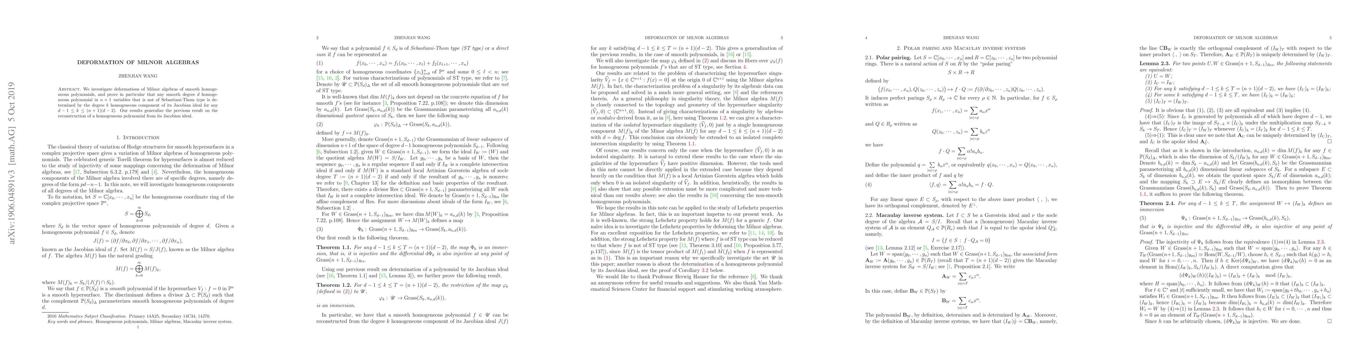 We investigate deformations of Milnor algebras of smooth homogeneous polynomials, and prove in particular that any smooth degree $d$ homogeneous polynomial in $n+1$ variables that is not of Sebastiani-Thom type is determined by the degree $k$ homogeneous component of its Jacobian ideal for any $d-1\leq k\leq (n+1)(d-2)$. Our results generalize the previous result on the reconstruction of a homogeneous polynomial from its Jacobian ideal.