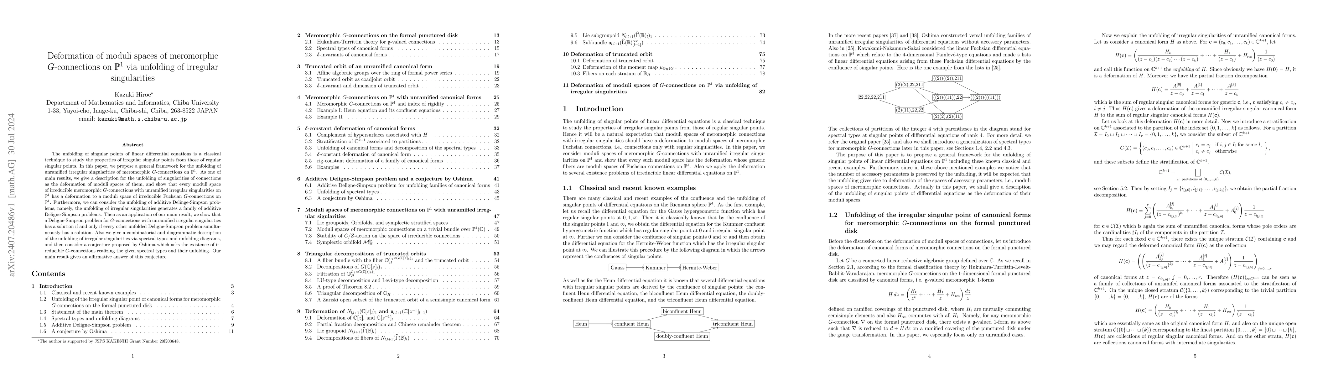 This paper develops a framework for unfolding unramified irregular singularities of meromorphic $G$-connections on $\mathbb{P}^{1}$, showing that moduli spaces of such connections can be deformed into moduli spaces of Fuchsian $G$-connections. It also proves that Deligne-Simpson problems for these connections have solutions if and only if their unfolded versions do, and affirms Oshima's conjecture regarding the existence of irreducible $G$-connections with given spectral types.