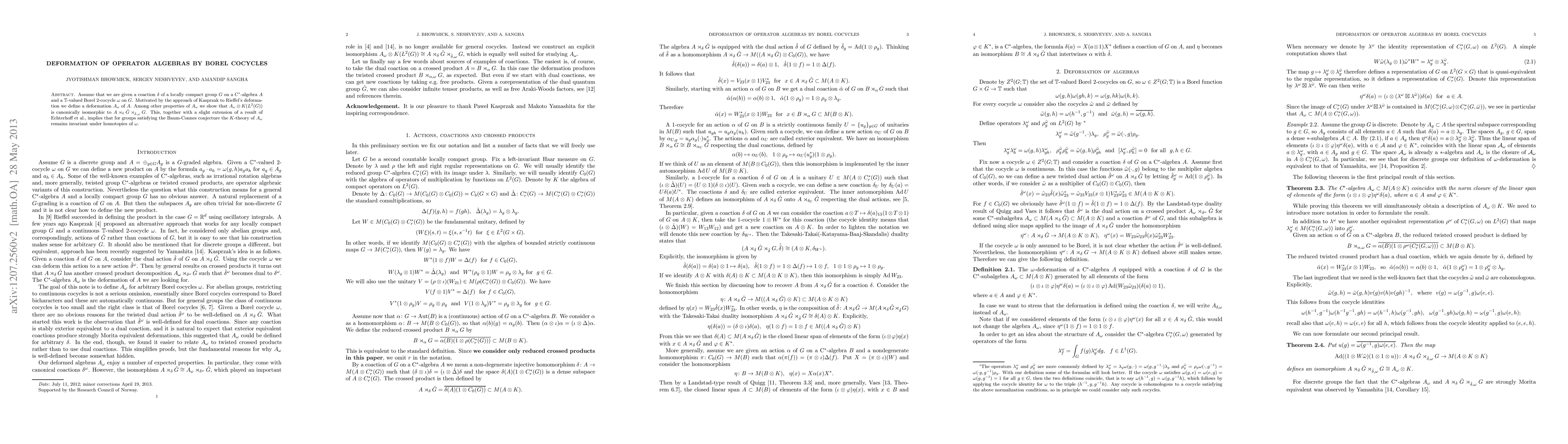 Assume that we are given a coaction \delta of a locally compact group G on a C*-algebra A and a T-valued Borel 2-cocycle \omega on G. Motivated by the approach of Kasprzak to Rieffel's deformation we define a deformation A_\omega of A. Among other properties of A_\omega we show that A_\omega\otimes K(L^2(G)) is canonically isomorphic to A\rtimes_\delta\hat G\rtimes_{\hat\delta,\omega}G. This, together with a slight extension of a result of Echterhoff et al., implies that for groups satisfying the Baum-Connes conjecture the K-theory of A_\omega remains invariant under homotopies of omega.