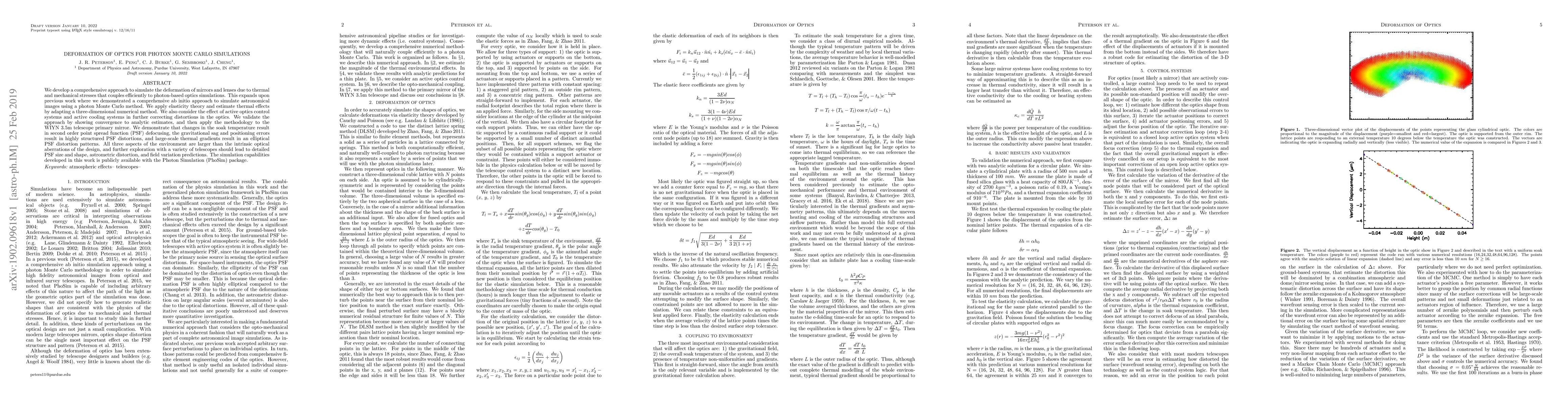 We develop a comprehensive approach to simulate the deformation of mirrors and lenses due to thermal and mechanical stresses that couples efficiently to photon-based optics simulations. This expands upon previous work where we demonstrated a comprehensive ab initio approach to simulate astronomical images using a photon Monte Carlo method. We apply elasticity theory and estimate thermal effects by adapting a three-dimensional numerical method. We also consider the effect of active optics control systems and active cooling systems in further correcting distortions in the optics. We validate the approach by showing convergence to analytic estimates, and then apply the methodology to the WIYN 3.5m telescope primary mirror. We demonstrate that changes in the soak temperature result in second order point spread function (PSF) defocusing, the gravitational sag and positioning errors result in highly structured PSF distortions, and large-scale thermal gradients result in an elliptical PSF distortion patterns. All three aspects of the environment are larger than the intrinsic optical aberrations of the design, and further exploration with a variety of telescopes should lead to detailed PSF size and shape, astrometric distortion, and field variation predictions. The simulation capabilities developed in this work is publicly available with the Photon Simulation (PhoSim) package.
