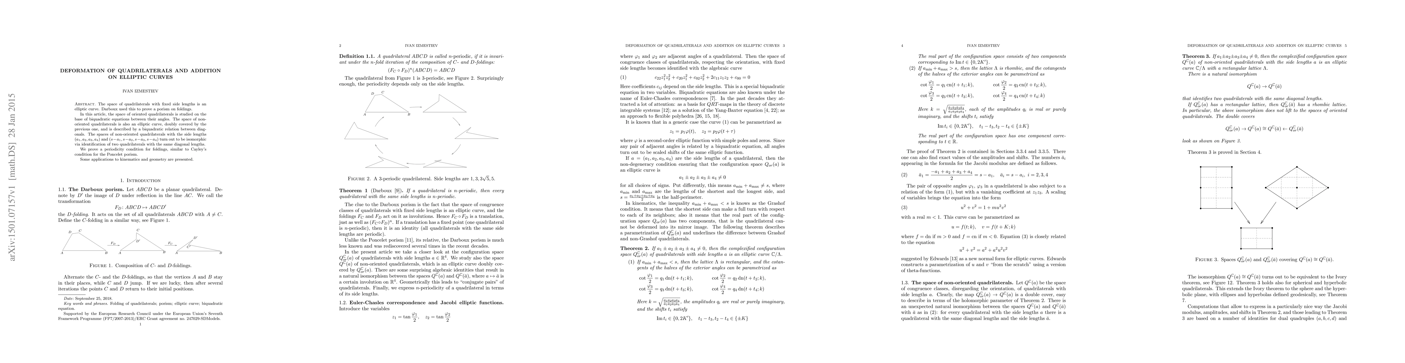 This paper explores the elliptic curve formed by quadrilaterals with fixed side lengths, demonstrating that the space of oriented quadrilaterals is governed by biquadratic angle equations. It further shows that the non-oriented quadrilaterals form a doubly covered elliptic curve described by biquadratic diagonal relations, proving a periodicity condition for foldings akin to Cayley's condition for the Poncelet porism, and presenting applications in kinematics and geometry.
