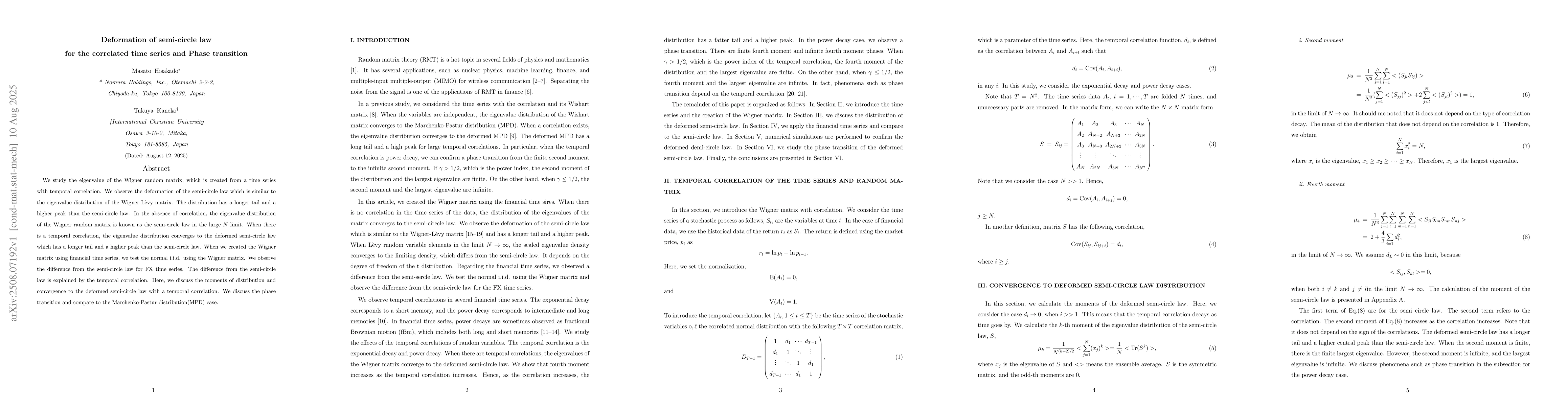 We study the eigenvalue of the Wigner random matrix, which is created from a time series with temporal correlation. We observe the deformation of the semi-circle law which is similar to the eigenvalue distribution of the Wigner-L\`{e}vy matrix. The distribution has a longer tail and a higher peak than the semi-circle law. In the absence of correlation, the eigenvalue distribution of the Wigner random matrix is known as the semi-circle law in the large $N$ limit. When there is a temporal correlation, the eigenvalue distribution converges to the deformed semi-circle law which has a longer tail and a higher peak than the semi-circle law. When we created the Wigner matrix using financial time series, we test the normal i.i.d. using the Wigner matrix. We observe the difference from the semi-circle law for FX time series. The difference from the semi-circle law is explained by the temporal correlation. Here, we discuss the moments of distribution and convergence to the deformed semi-circle law with a temporal correlation. We discuss the phase transition and compare to the Marchenko-Pastur distribution(MPD) case.
