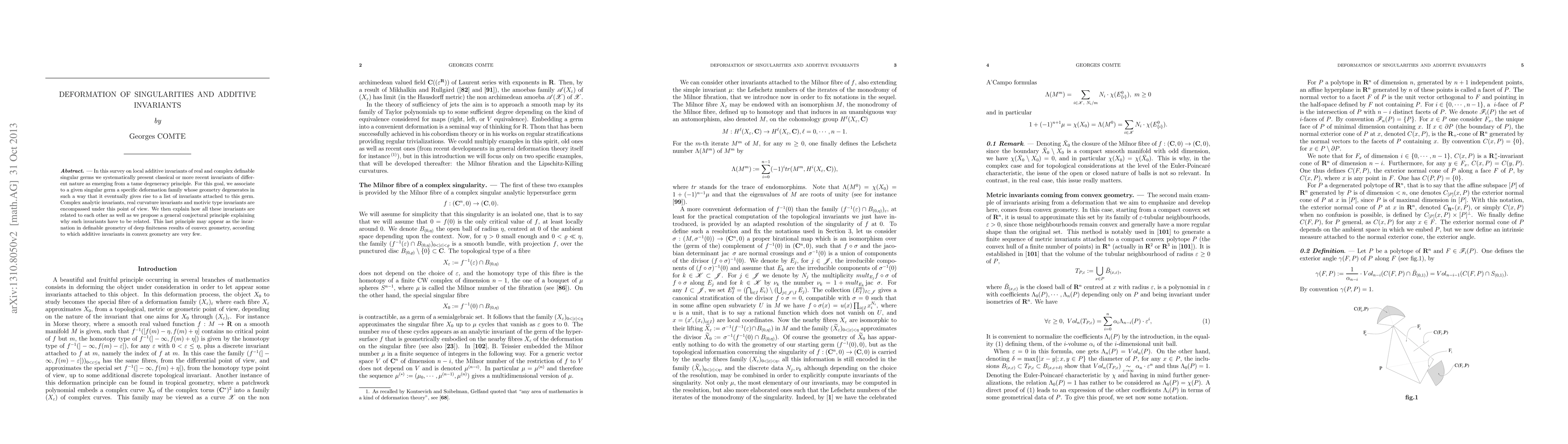 In this survey on local additive invariants of real and complex definable singular germs we systematically present classical or more recent invariants of different nature as emerging from a tame degeneracy principle. For this goal, we associate to a given singular germ a specific deformation family whose geometry degenerates in such a way that it eventually gives rise to a list of invariants attached to this germ. Complex analytic invariants, real curvature invariants and motivic type invariants are encompassed under this point of view. We then explain how all these invariants are related to each other as well as we propose a general conjectural principle explaining why such invariants have to be related. This last principle may appear as the incarnation in definable geometry of deep finiteness results of convex geometry, according to which additive invariants in convex geometry are very few.