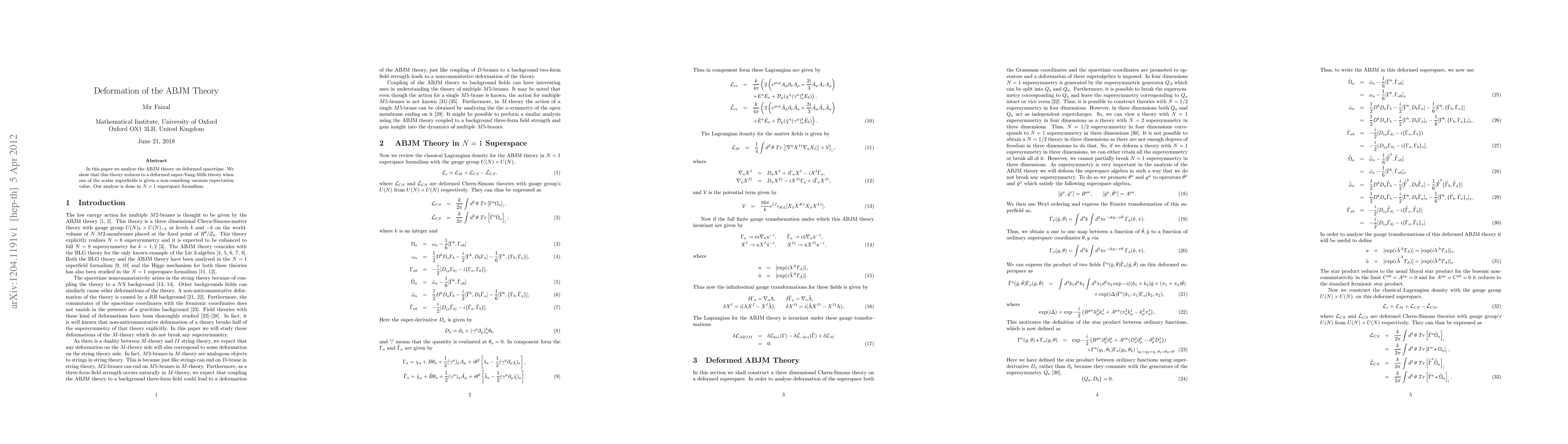 This paper examines the ABJM theory on deformed spacetime, demonstrating that it simplifies to a deformed super-Yang-Mills theory when a scalar superfield acquires a non-zero vacuum expectation value, analyzed using N=1 superspace formalism.