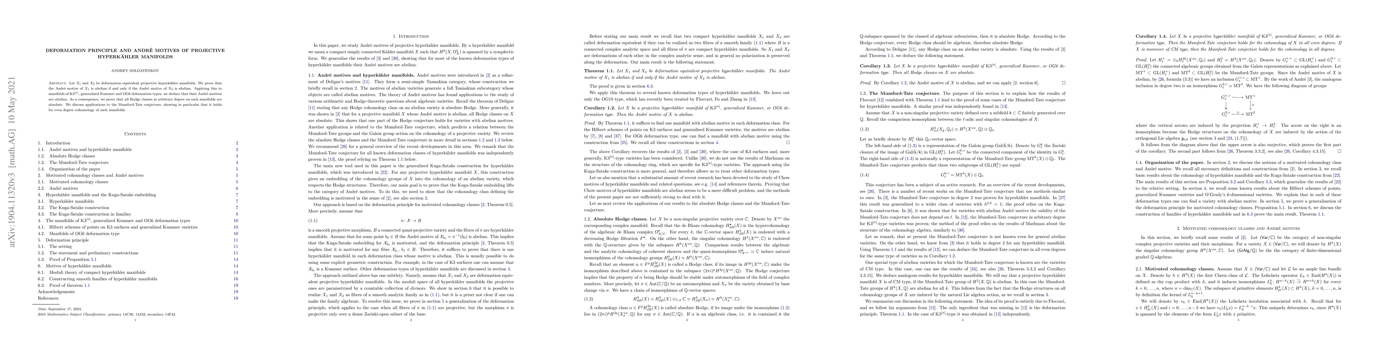 This paper establishes that deformation equivalent projective hyperkähler manifolds share abelian Andr\'e motives. It applies this result to K3, generalized Kummer, and OG6 manifolds, proving their Andr\'e motives are abelian, thereby ensuring all Hodge classes on these manifolds are absolute. Additionally, it confirms the Mumford-Tate conjecture for even degree cohomology of these manifolds.