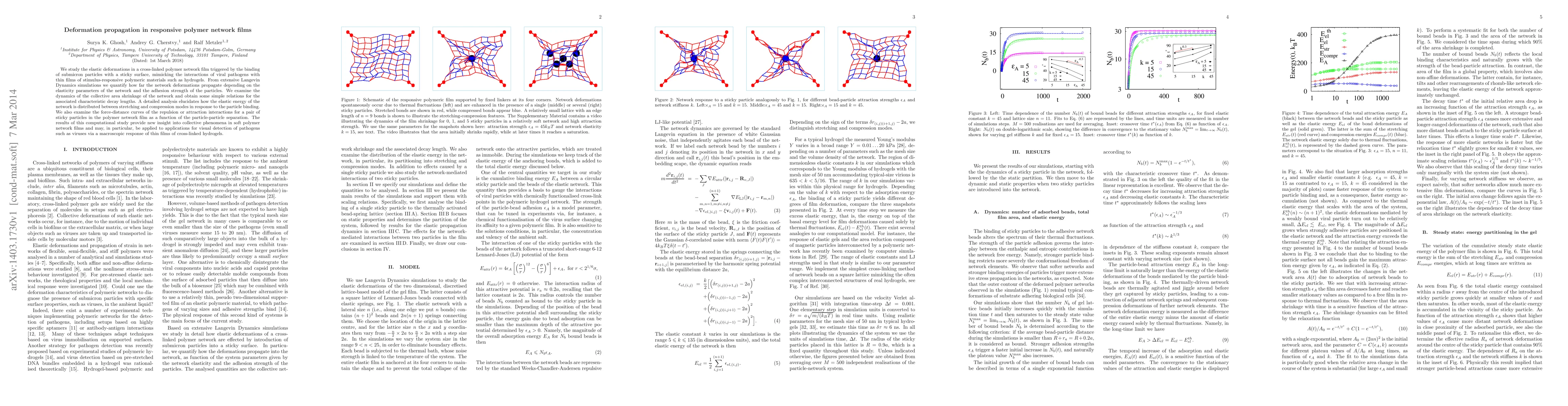 This paper investigates the elastic deformations in responsive polymer network films due to the binding of sticky submicron particles, using Langevin Dynamics simulations to quantify deformation propagation. The study reveals characteristic decay lengths and energy distribution between stretching and compression, with implications for visual detection of pathogens via macroscopic responses in hydrogel films.
