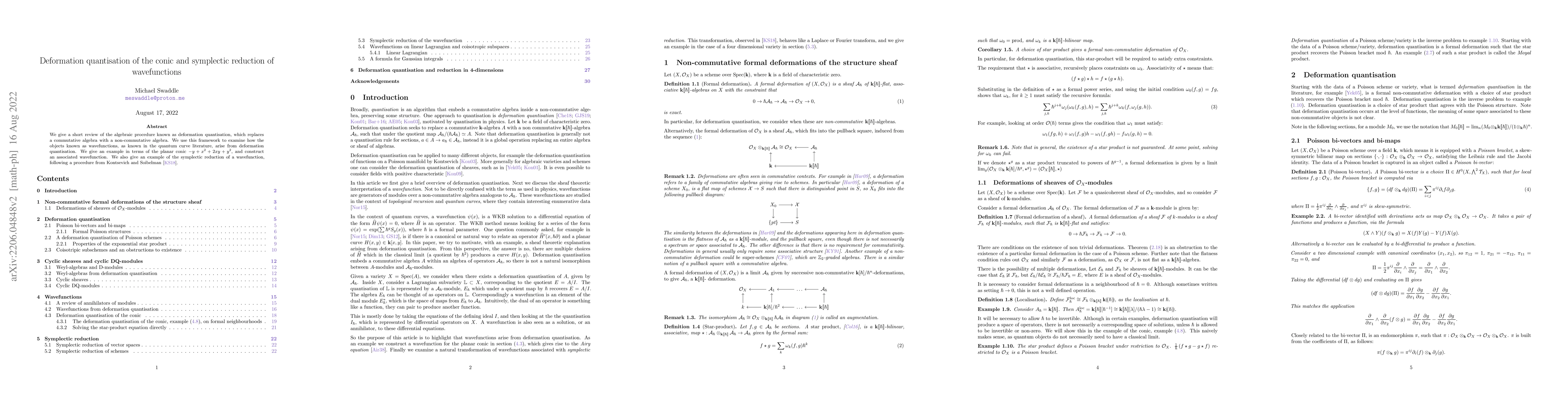 This paper reviews deformation quantisation, a method that transforms commutative algebras into non-commutative ones, and applies it to derive quantum wavefunctions from the planar conic $-y+x^2+2xy+y^2$. It also explores symplectic reduction of wavefunctions via a procedure from Kontsevich and Soibelman.