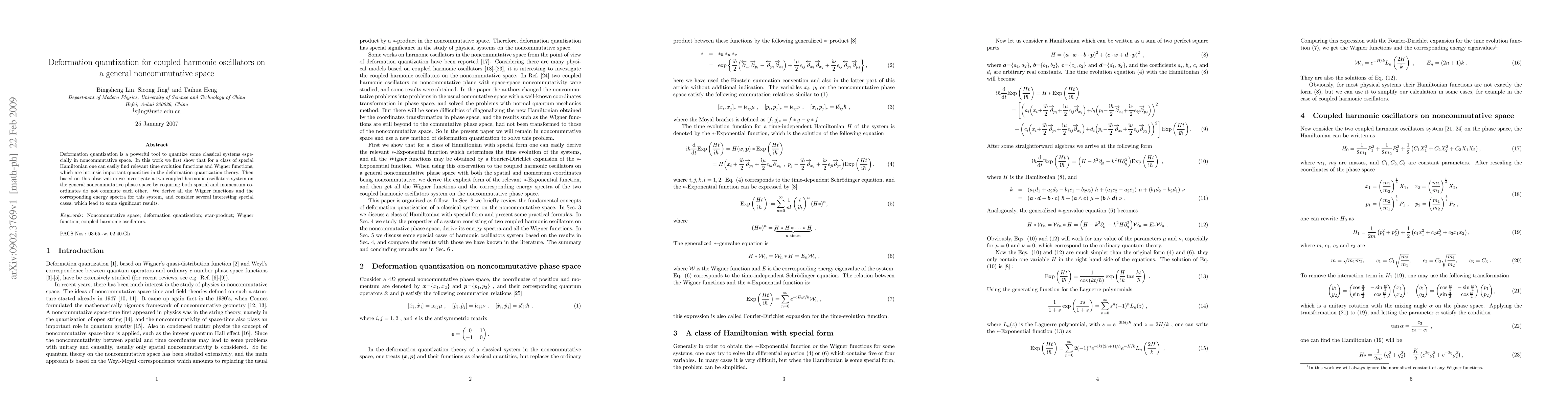 This paper explores deformation quantization for coupled harmonic oscillators on a noncommutative space, deriving relevant time evolution and Wigner functions. It investigates the system's energy spectra and special cases, revealing significant results.