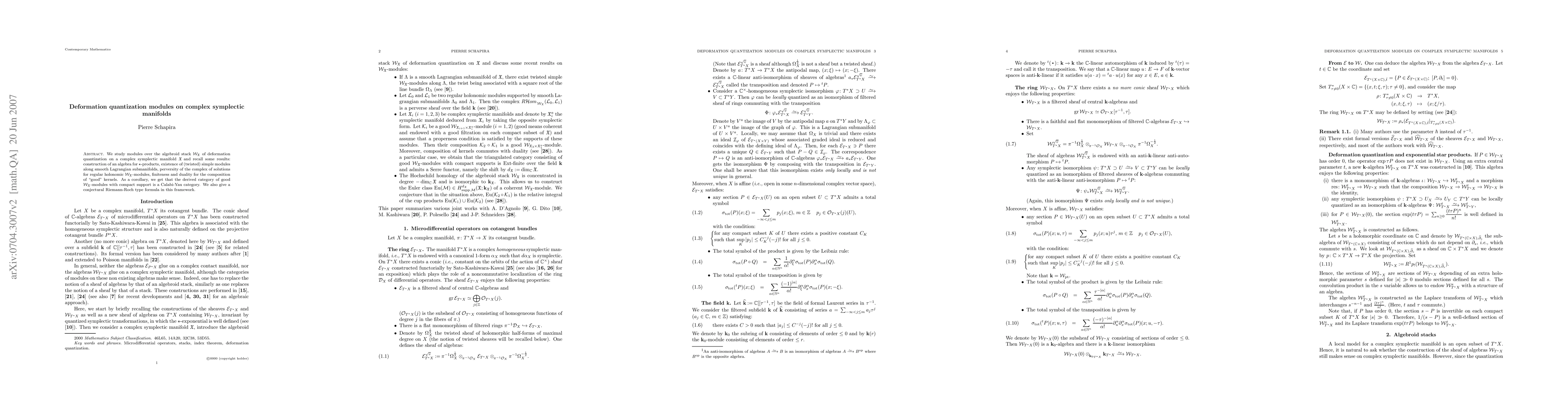 This paper explores deformation quantization modules on complex symplectic manifolds, detailing constructions of star-product algebras, existence of simple modules along Lagrangian submanifolds, and properties of regular holonomic modules. It concludes with a derived category result and a Riemann-Roch type conjecture.