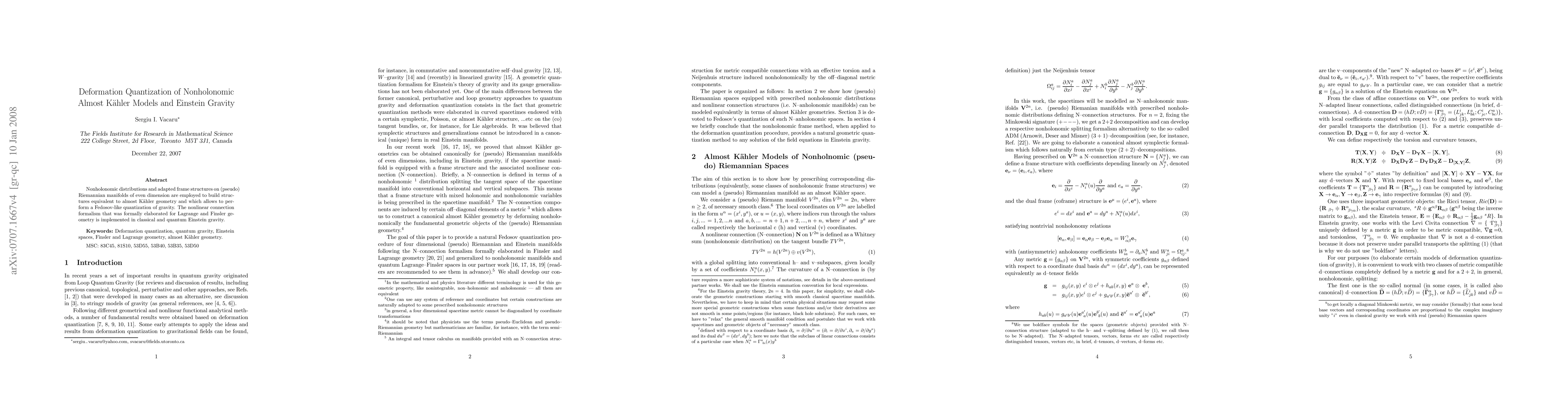 This paper explores the deformation quantization of nonholonomic almost Kahler models using adapted frame structures on even-dimensional (pseudo) Riemannian manifolds, enabling a Fedosov-like quantization approach to gravity, and applies the nonlinear connection formalism to classical and quantum Einstein gravity.