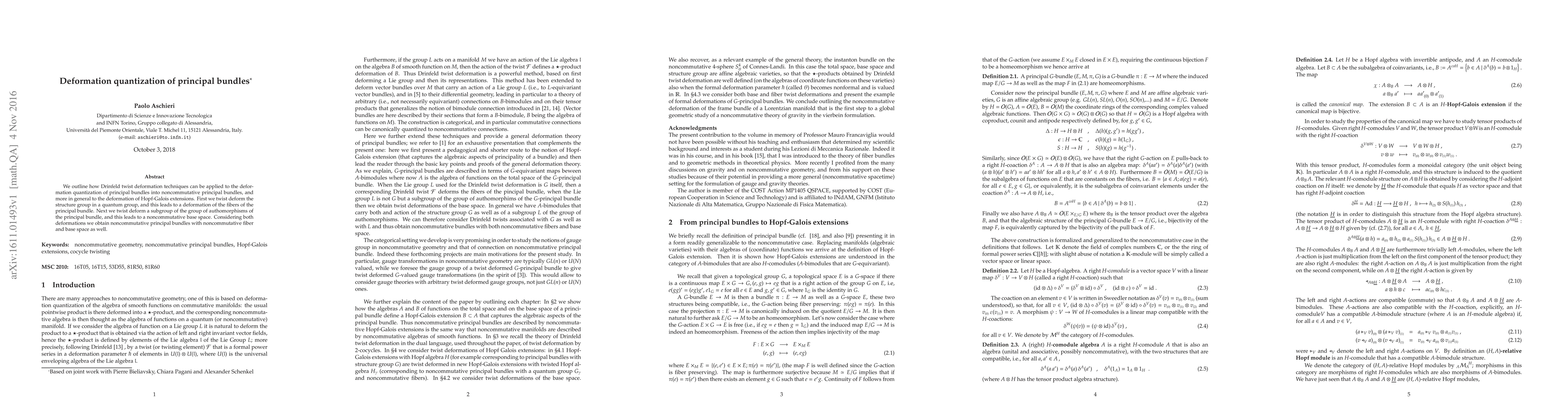 We outline how Drinfeld twist deformation techniques can be applied to the deformation quantization of principal bundles into noncommutative principal bundles, and more in general to the deformation of Hopf-Galois extensions. First we twist deform the structure group in a quantum group, and this leads to a deformation of the fibers of the principal bundle. Next we twist deform a subgroup of the group of authomorphisms of the principal bundle, and this leads to a noncommutative base space. Considering both deformations we obtain noncommutative principal bundles with noncommutative fiber and base space as well.