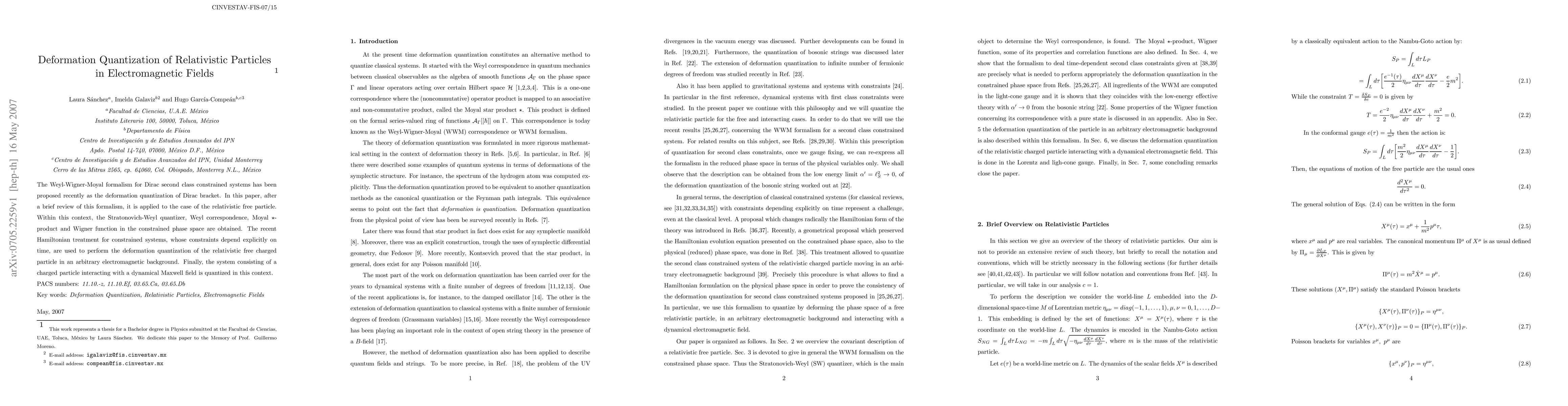 This paper applies the Weyl-Wigner-Moyal formalism to the relativistic free particle and quantizes the relativistic free charged particle in electromagnetic fields, employing the Hamiltonian treatment for time-dependent constraints and extending the quantization to a charged particle interacting with a dynamical Maxwell field.