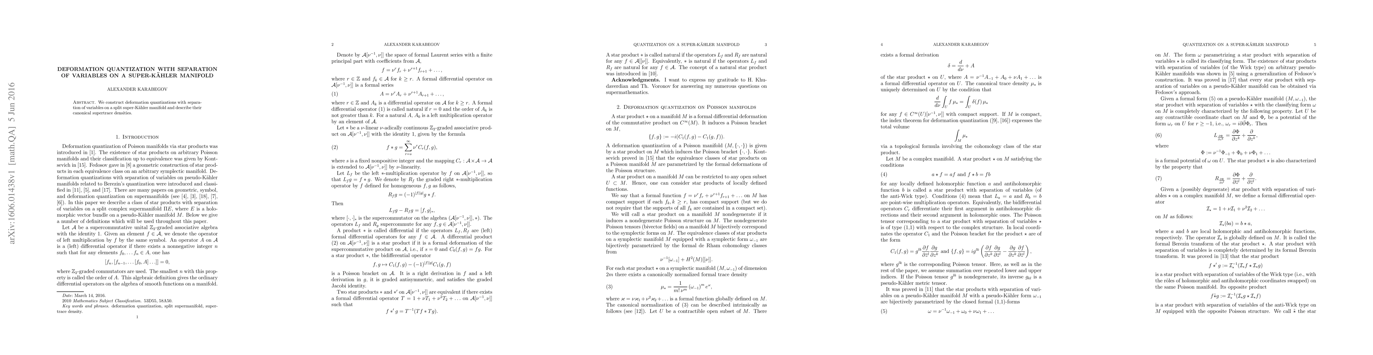 Summary: The paper constructs deformation quantizations that utilize separation of variables on a split super-Kähler manifold and analyzes their canonical supertrace densities. This provides a novel approach to quantizing super-Kähler structures with a focus on variable separation techniques.