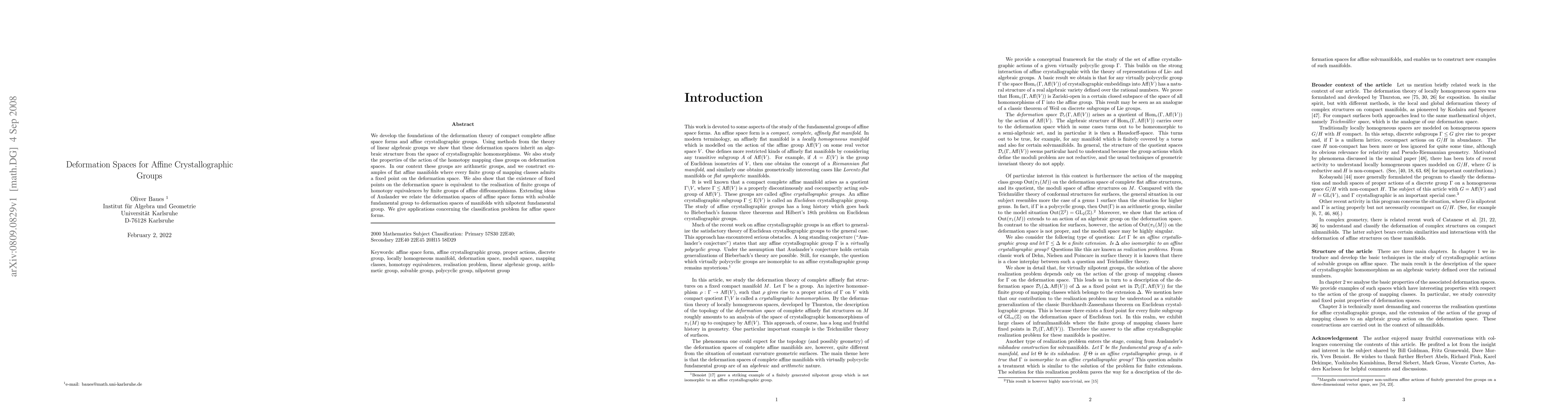 We develop the foundations of the deformation theory of compact complete affine space forms and affine crystallographic groups. Using methods from the theory of linear algebraic groups we show that these deformation spaces inherit an algebraic structure from the space of crystallographic homomorphisms. We also study the properties of the action of the homotopy mapping class groups on deformation spaces. In our context these groups are arithmetic groups, and we construct examples of flat affine manifolds where every finite group of mapping classes admits a fixed point on the deformation space. We also show that the existence of fixed points on the deformation space is equivalent to the realisation of finite groups of homotopy equivalences by finite groups of affine diffeomorphisms. Extending ideas of Auslander we relate the deformation spaces of affine space forms with solvable fundamental group to deformation spaces of manifolds with nilpotent fundamental group. We give applications concerning the classification problem for affine space forms.