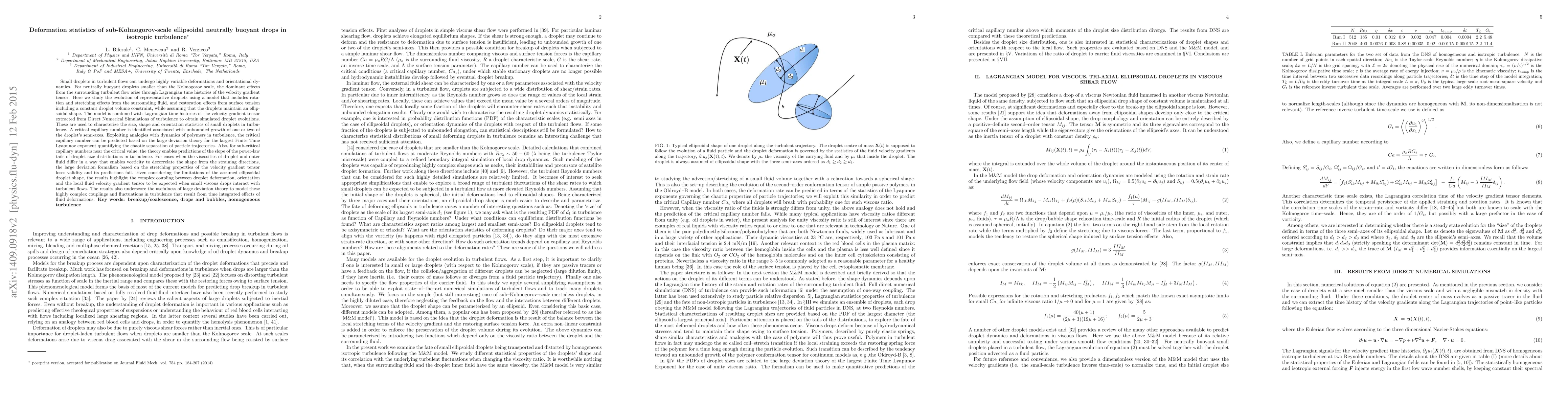 This paper investigates the deformation and orientation dynamics of neutrally buoyant ellipsoidal droplets smaller than the Kolmogorov scale in turbulent flows, using a model that accounts for fluid-induced rotation and stretching, and surface tension effects. It identifies a critical capillary number associated with unbounded droplet deformation and uses large deviation theory to predict the behavior of droplet size distributions.