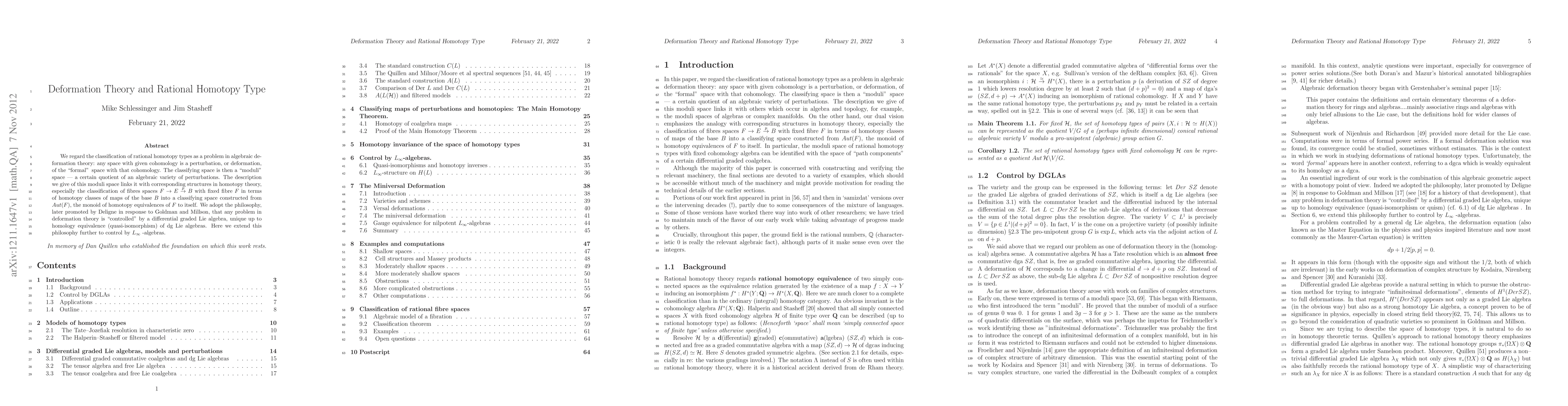 This paper explores the classification of rational homotopy types through algebraic deformation theory, considering any space with given cohomology as a deformation of a "formal" space. It identifies the classifying space as a moduli space, linking it with homotopy theory structures and extending the use of differential graded Lie algebras in controlling deformation problems.