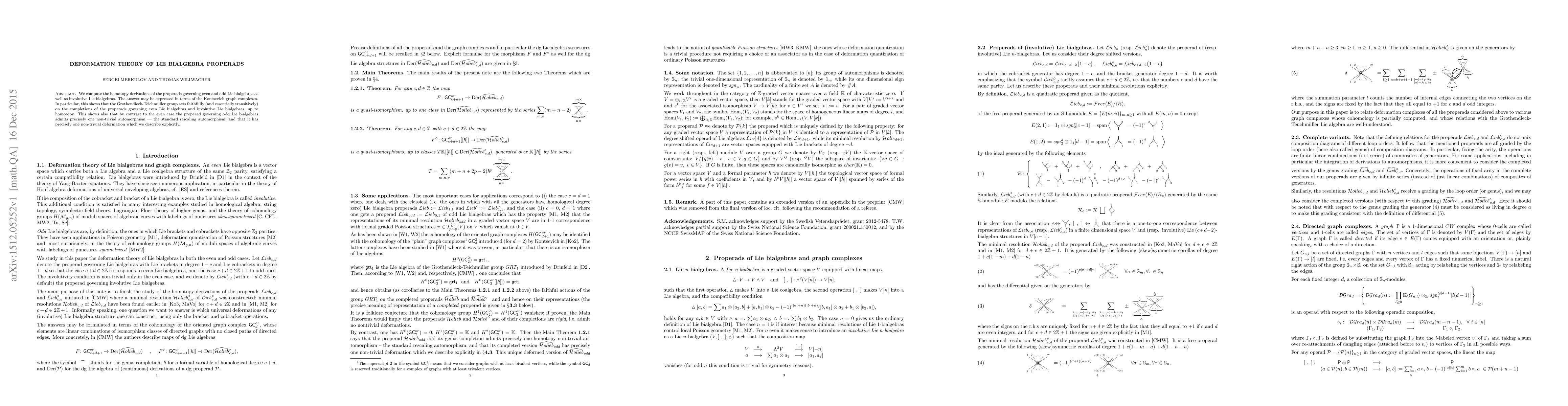 We compute the homotopy derivations of the properads governing even and odd Lie bialgebras as well as involutive Lie bialgebras. The answer may be expressed in terms of the Kontsevich graph complexes. In particular, this shows that the Grothendieck-Teichm\"uller group acts faithfully (and essentially transitively) on the completions of the properads governing even Lie bialgebras and involutive Lie bialgebras, up to homotopy. This shows also that by contrast to the even case the properad governing odd Lie bialgebras admits precisely one non-trivial automorphism - the standard rescaling automorphism, and that it has precisely one non-trivial deformation which we describe explicitly.