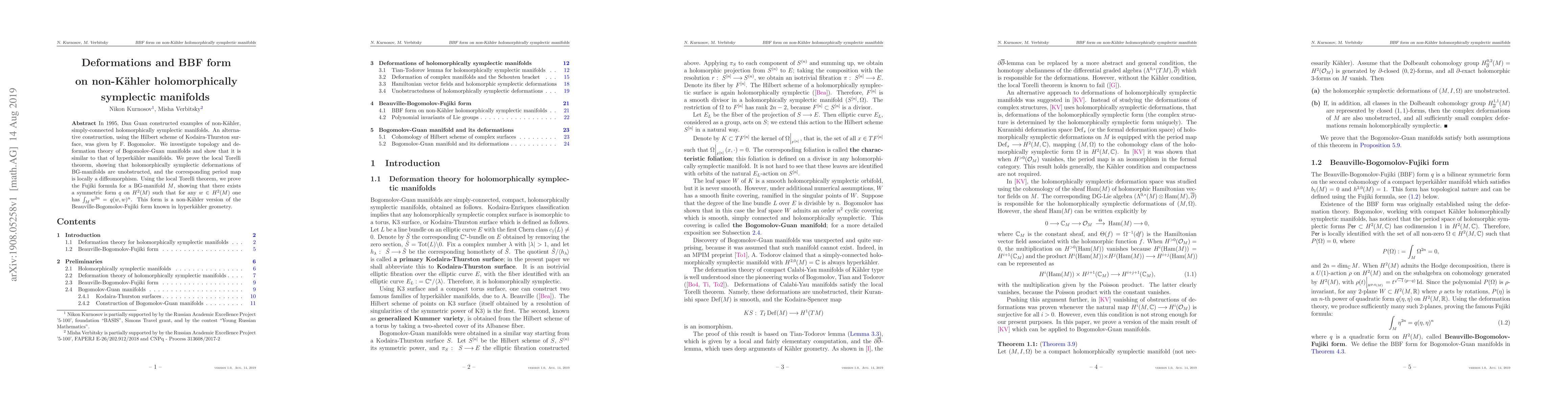 This paper explores the topology and deformation theory of non-Kahler, holomorphically symplectic manifolds constructed by Dan Guan and F. Bogomolov, demonstrating their similarity to hyperkähler manifolds. It proves the local Torelli theorem and the Fujiki formula, establishing the existence of a non-Kahler version of the Beauville-Bogomolov-Fujiki form.