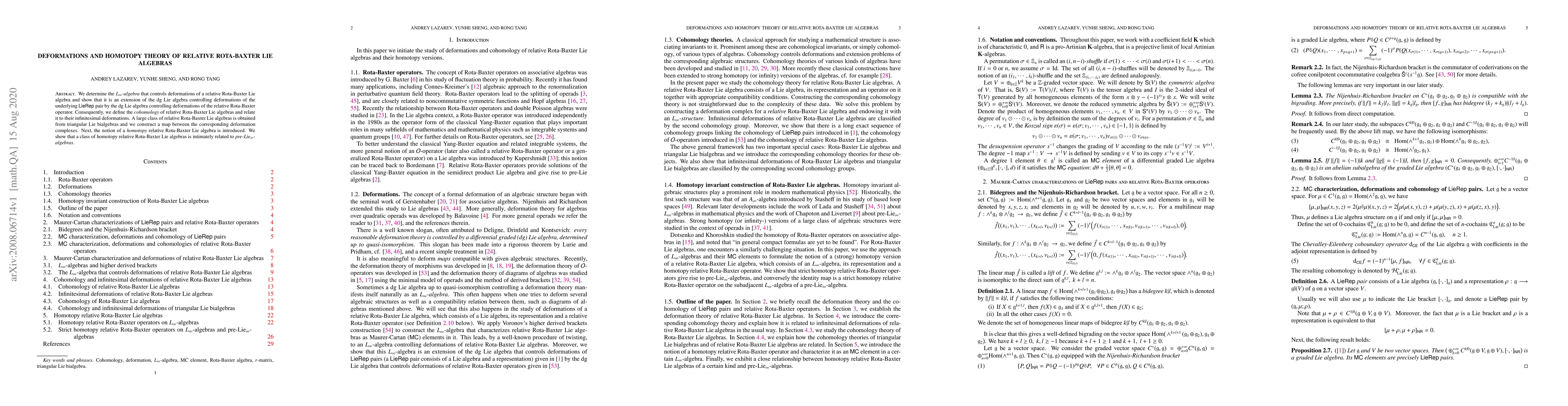 We determine the \emph{$L_\infty$-algebra} that controls deformations of a relative Rota-Baxter Lie algebra and show that it is an extension of the dg Lie algebra controlling deformations of the underlying LieRep pair by the dg Lie algebra controlling deformations of the relative Rota-Baxter operator. Consequently, we define the {\em cohomology} of relative Rota-Baxter Lie algebras and relate it to their infinitesimal deformations. A large class of relative Rota-Baxter Lie algebras is obtained from triangular Lie bialgebras and we construct a map between the corresponding deformation complexes. Next, the notion of a \emph{homotopy} relative Rota-Baxter Lie algebra is introduced. We show that a class of homotopy relative Rota-Baxter Lie algebras is intimately related to \emph{pre-Lie$_\infty$-algebras}.