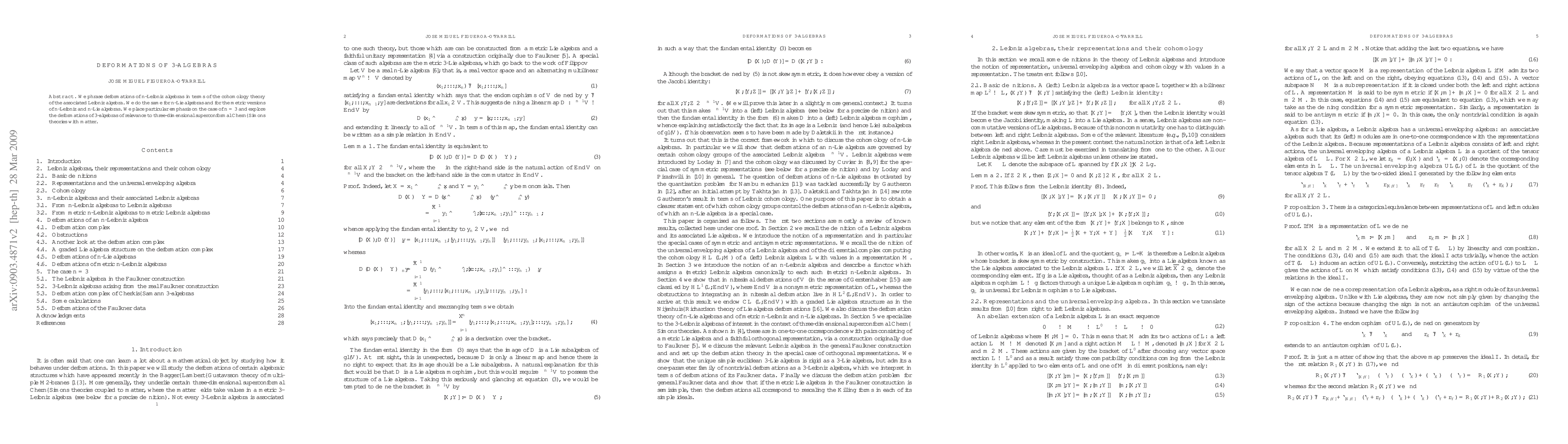 We phrase deformations of n-Leibniz algebras in terms of the cohomology theory of the associated Leibniz algebra. We do the same for n-Lie algebras and for the metric versions of n-Leibniz and n-Lie algebras. We place particular emphasis on the case of n=3 and explore the deformations of 3-algebras of relevance to three-dimensional superconformal Chern--Simons theories with matter.