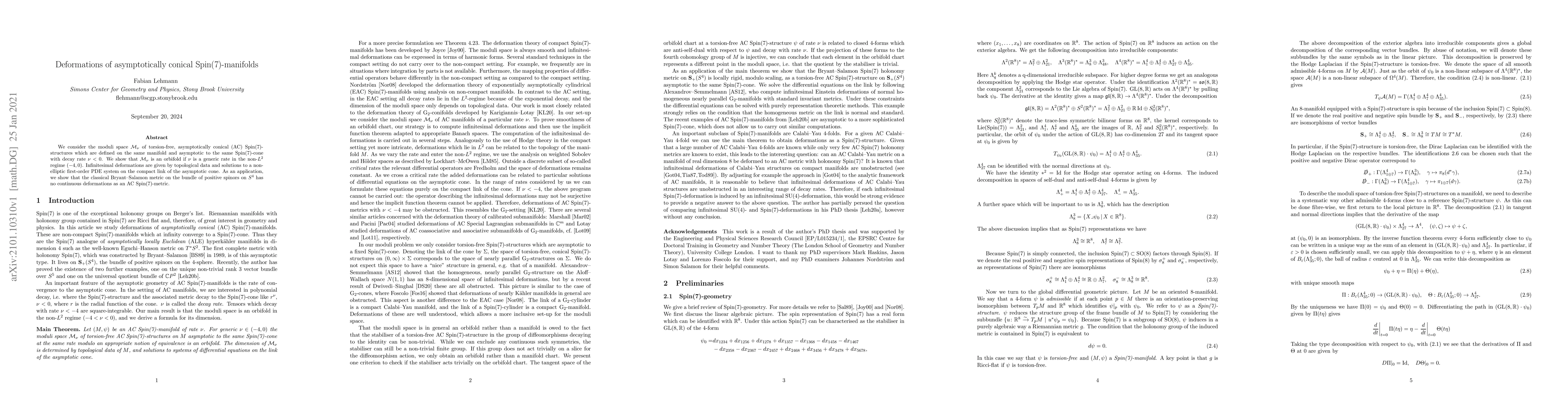 This paper studies the moduli space of torsion-free asymptotically conical Spin(7)-structures, demonstrating that it forms an orbifold for certain decay rates. Infinitesimal deformations are linked to topological data and solutions of a non-elliptic PDE system. It concludes that the Bryant-Salamon metric on $S^4$ cannot be continuously deformed as an AC Spin(7)-metric.