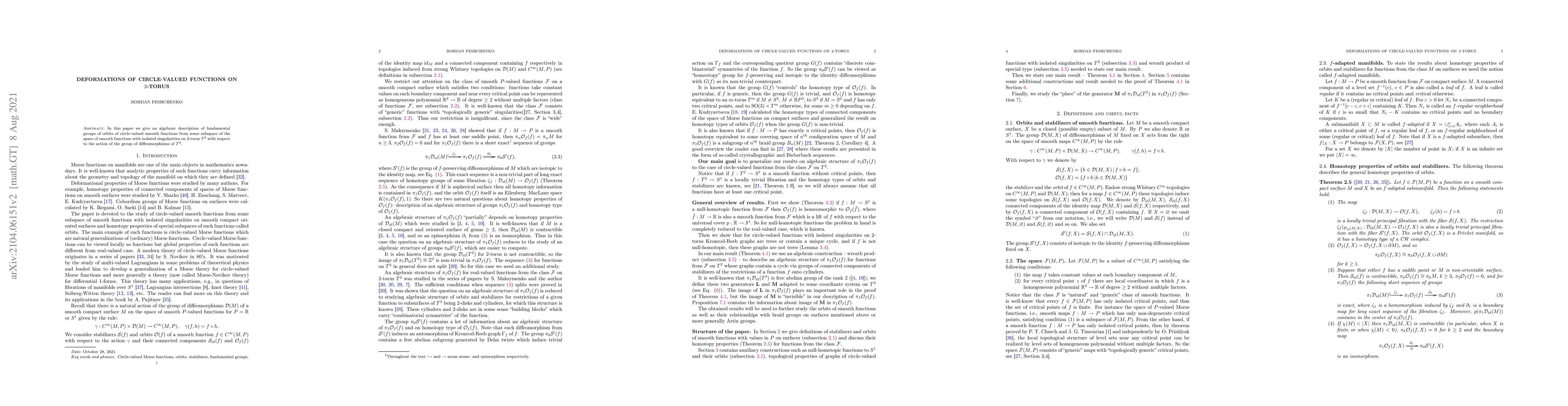 This paper provides an algebraic description of the fundamental groups of orbits of circle-valued smooth functions on the 2-torus, focusing on functions with isolated singularities, under the action of the group of diffeomorphisms of the 2-torus.