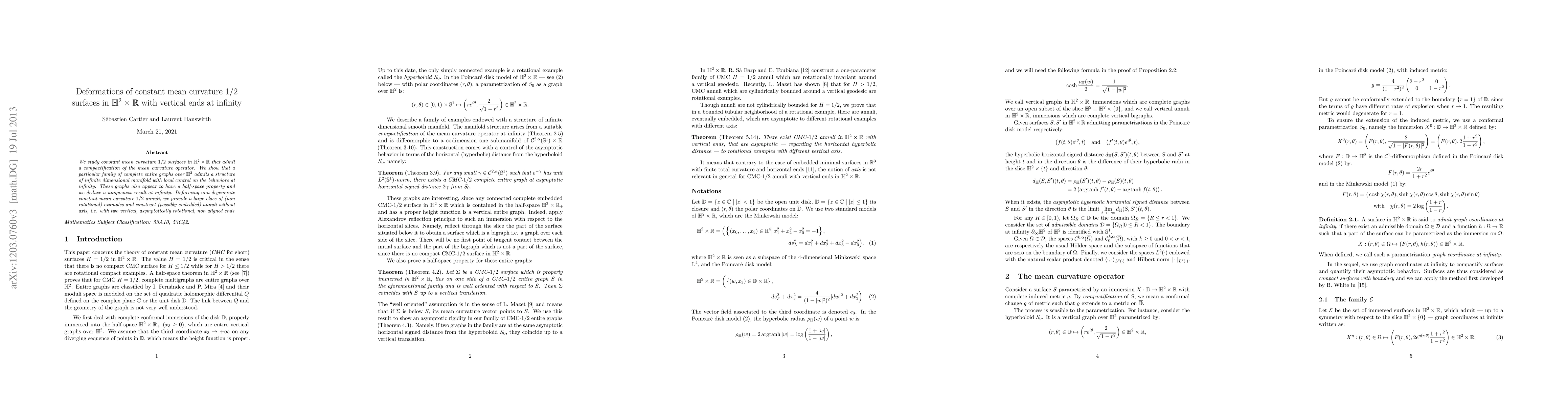 We study constant mean curvature 1/2 surfaces in H2xR that admit a compactification of the mean curvature operator. We show that a particular family of complete entire graphs over H2 admits a structure of infinite dimensional manifold with local control on the behaviors at infinity. These graphs also appear to have a half-space property and we deduce a uniqueness result at infinity. Deforming non degenerate constant mean curvature 1/2 annuli, we provide a large class of (non rotational) examples and construct (possibly embedded) annuli without axis, i.e. with two vertical, asymptotically rotational, non aligned ends.