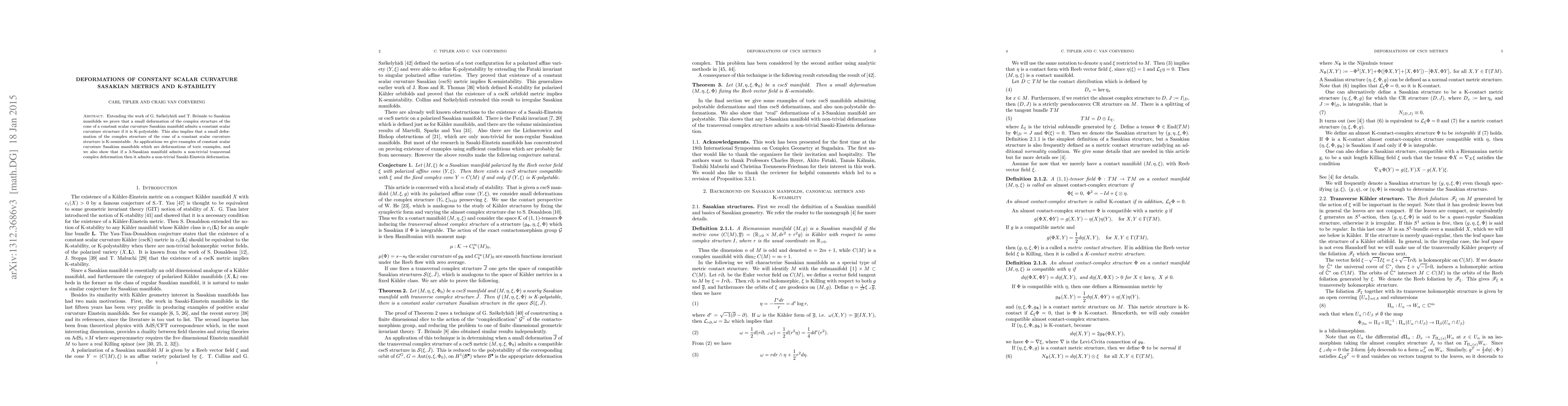 This paper proves that small deformations of the complex structure of the cone over a constant scalar curvature Sasakian manifold retain a constant scalar curvature structure if the manifold is K-polystable. It also demonstrates that such deformations are K-semistable, providing examples of toric constant scalar curvature Sasakian manifolds and showing that 3-Sasakian manifolds with non-trivial transversal complex deformations have non-trivial Sasaki-Einstein deformations.