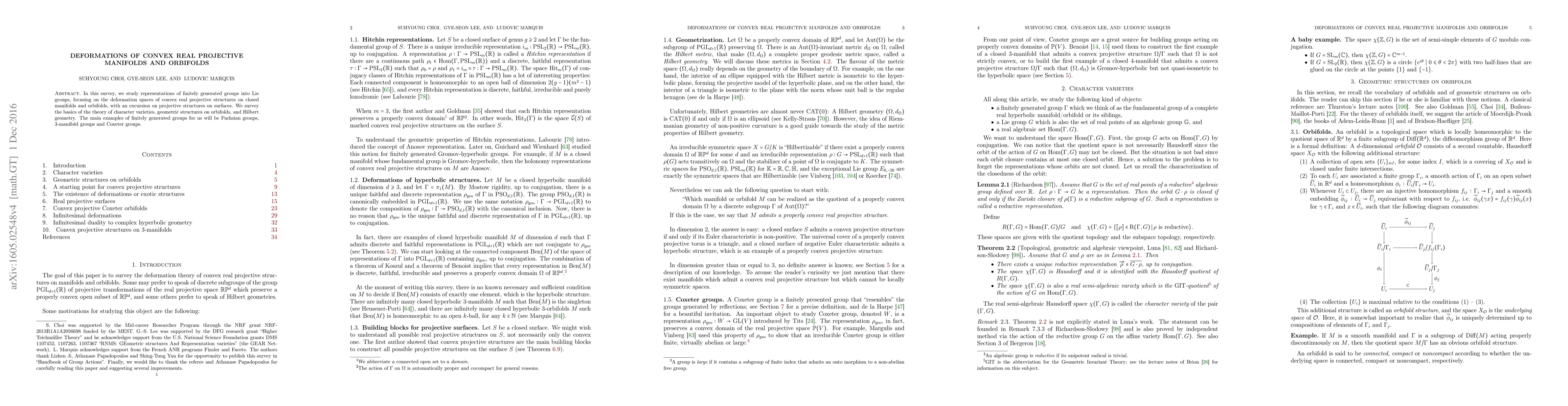 This paper surveys deformations of convex real projective structures on closed manifolds and orbifolds, exploring character varieties and geometric structures with a focus on Fuchsian, 3-manifold, and Coxeter groups. Key concepts include Hilbert geometry and projective structures on surfaces.