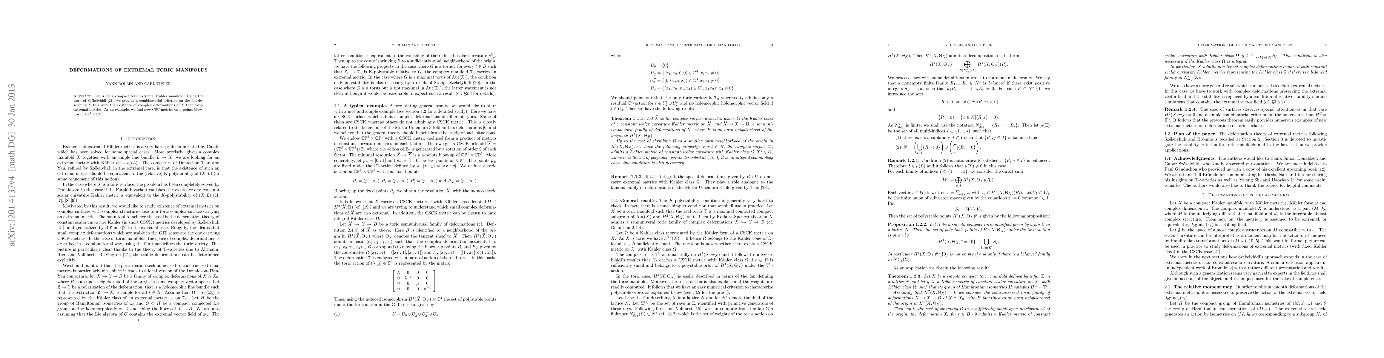 This paper provides a combinatorial criterion for the existence of complex deformations of compact toric extremal Kähler manifolds that preserve extremal metrics, exemplified by new CSC metrics on 4-point blow-ups of $\C\P^1\times\C\P^1$.