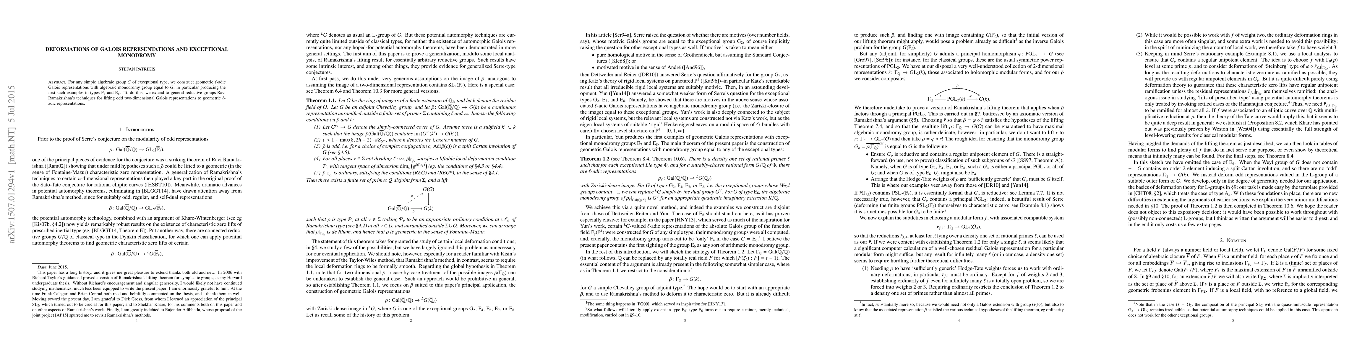 For any simple algebraic group $G$ of exceptional type, we construct geometric $\ell$-adic Galois representations with algebraic monodromy group equal to $G$, in particular producing the first such examples in types $\mathrm{F}_4$ and $\mathrm{E}_6$. To do this, we extend to general reductive groups Ravi Ramakrishna's techniques for lifting odd two-dimensional Galois representations to geometric $\ell$-adic representations.