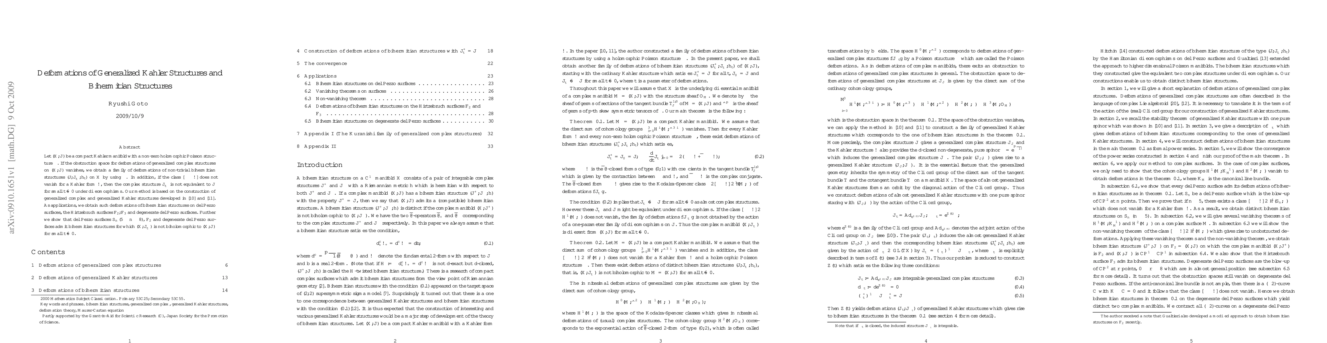 Let $(X, J)$ be a compact Kahler manifold with a non-zero holomorphic Poisson structure $\beta$. If the obstruction space for deformations of generalized complex structures on $(X, J)$ vanishes, we obtain a family of deformations of non-trivial bihermitian structures $(J, J^-_t, h_t)$ on $X$ by using $\beta$. In addition, if the class $[\beta\cdot \omega]$ does not vanish for a K\"ahler form $\omega$, then the complex structure $J_t^-$ is not equivalent to $J$ for small $t\neq 0$ under diffeomorphisms. Our method is based on the construction of generalized complex and Kahler structures developed in \cite{Go1} and \cite{Go2}. As applications, we obtain such deformations of bihermitian structures on del Pezzo surfaces, the Hirtzebruch surfaces $F_2, F_3$ and degenerate del Pezzo surfaces. Further we show that del Pezzo surfaces $S_n (5\leq n\leq 8)$, $F_2$ and degenerate del Pezzo surfaces admit bihermitian structures for which $(X, J^-_t)$ is not biholomorphic to $(X, J)$ for small $t\neq 0$.